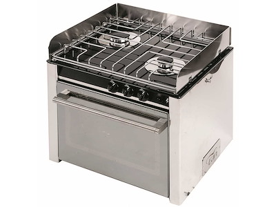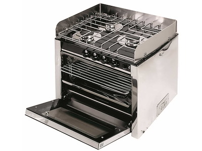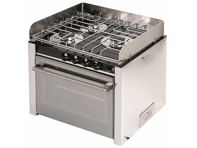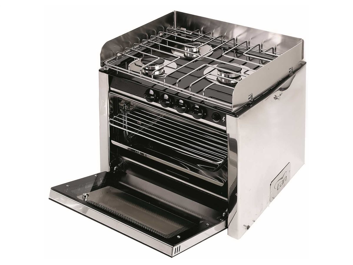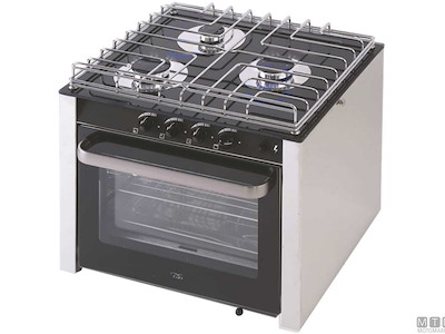 Cucine a gas con struttura in Acciaio Inox, top in cristallo antigraffio e forno da 30 litri. Complete con accensione a piezoelettrico e valvole di sicurezza su tutti i bruciatori. Griglia a filo unico che permette lo scorrimento delle pentole. Forno con maniglia ergonomica e porta ventilata doppio vetro con termometro integrato, griglia cuocicibo, dissipatore omogeneo di calore e copribruciatore in Alluminio. Potenza singolo bruciatore 1900W, forno 2000W.