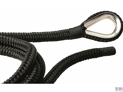 Treccia da ormeggio pronta con redancia in Acciaio Inox impiombata e rifinita a mano. Anche il terminale viene cucito e rifinito a mano per evitare imperfezioni. Robustissima e morbida, lavorazione a 16 fusi in Poliestere alta tenacità. La guaina è costruita e trattata per la massima resistenza all'abrasione. Non galleggia. daN= carico di rottura in Kg
