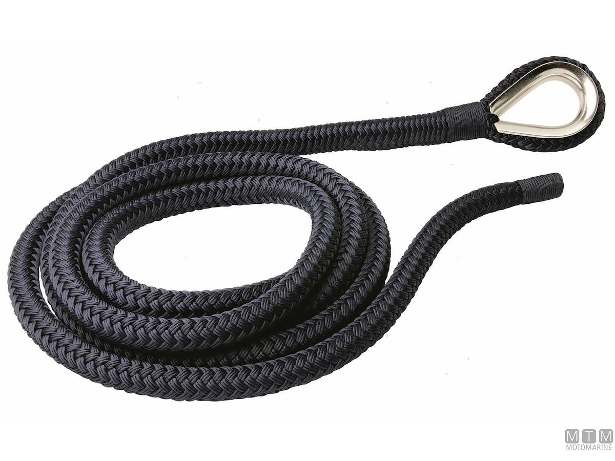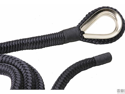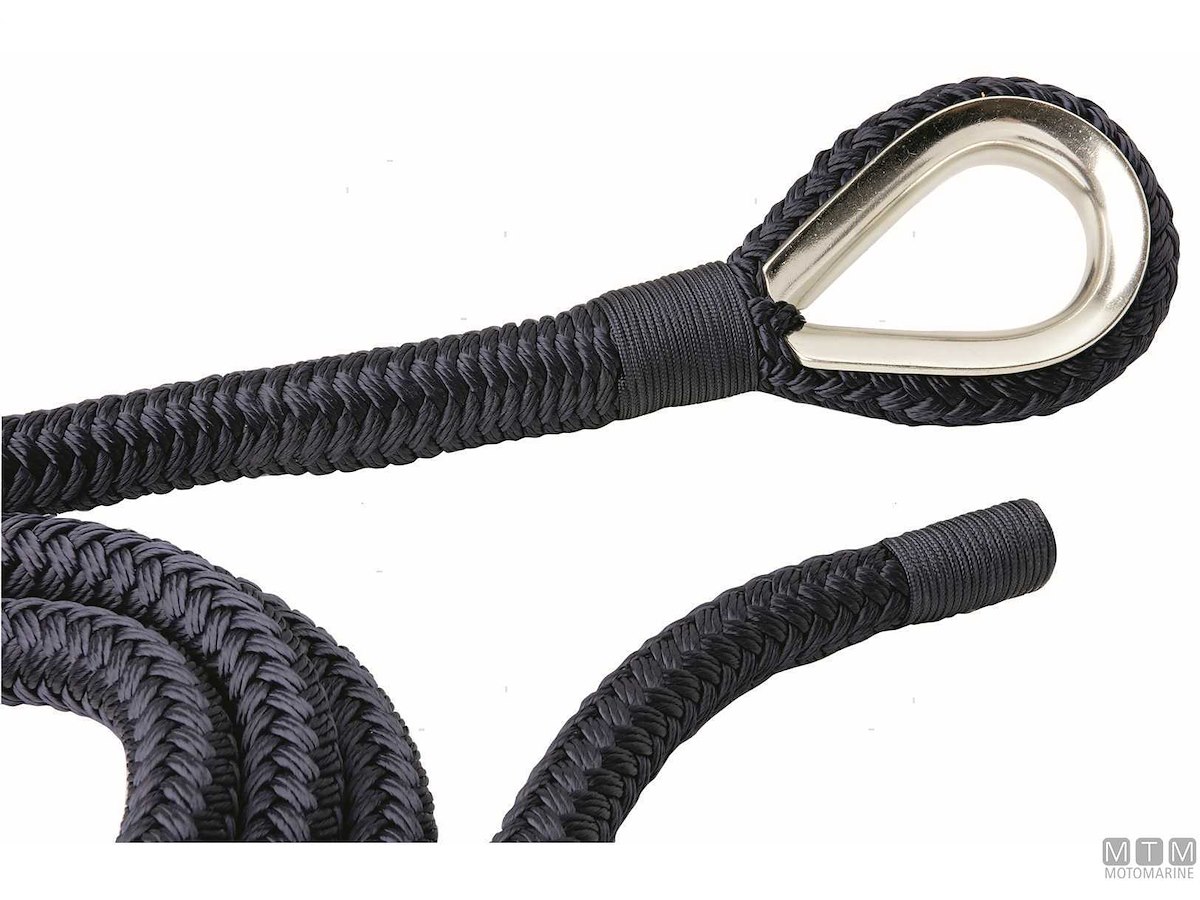 Treccia da ormeggio pronta con redancia in Acciaio Inox impiombata e rifinita a mano. Anche il terminale viene cucito e rifinito a mano per evitare imperfezioni. Robustissima e morbida, lavorazione a 16 fusi in Poliestere alta tenacità. La guaina è costruita e trattata per la massima resistenza all'abrasione. Non galleggia. daN= carico di rottura in Kg