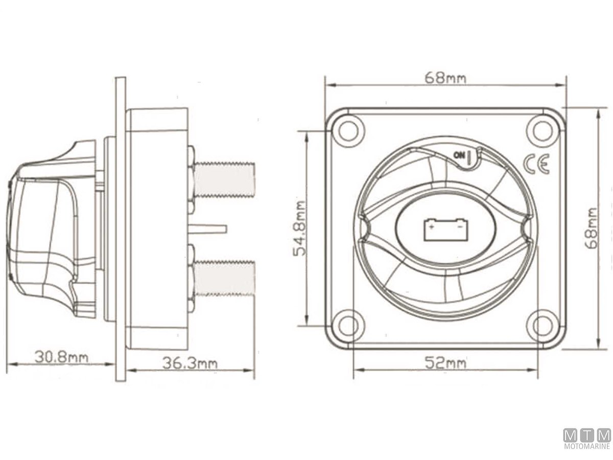 Deviatore staccabatterie con manopola a quattro posizioni e perni M8 in rame stagnato, montaggio a incasso. Collaudato per i valori di corrente e conforme ai requisiti di antideflagranza.