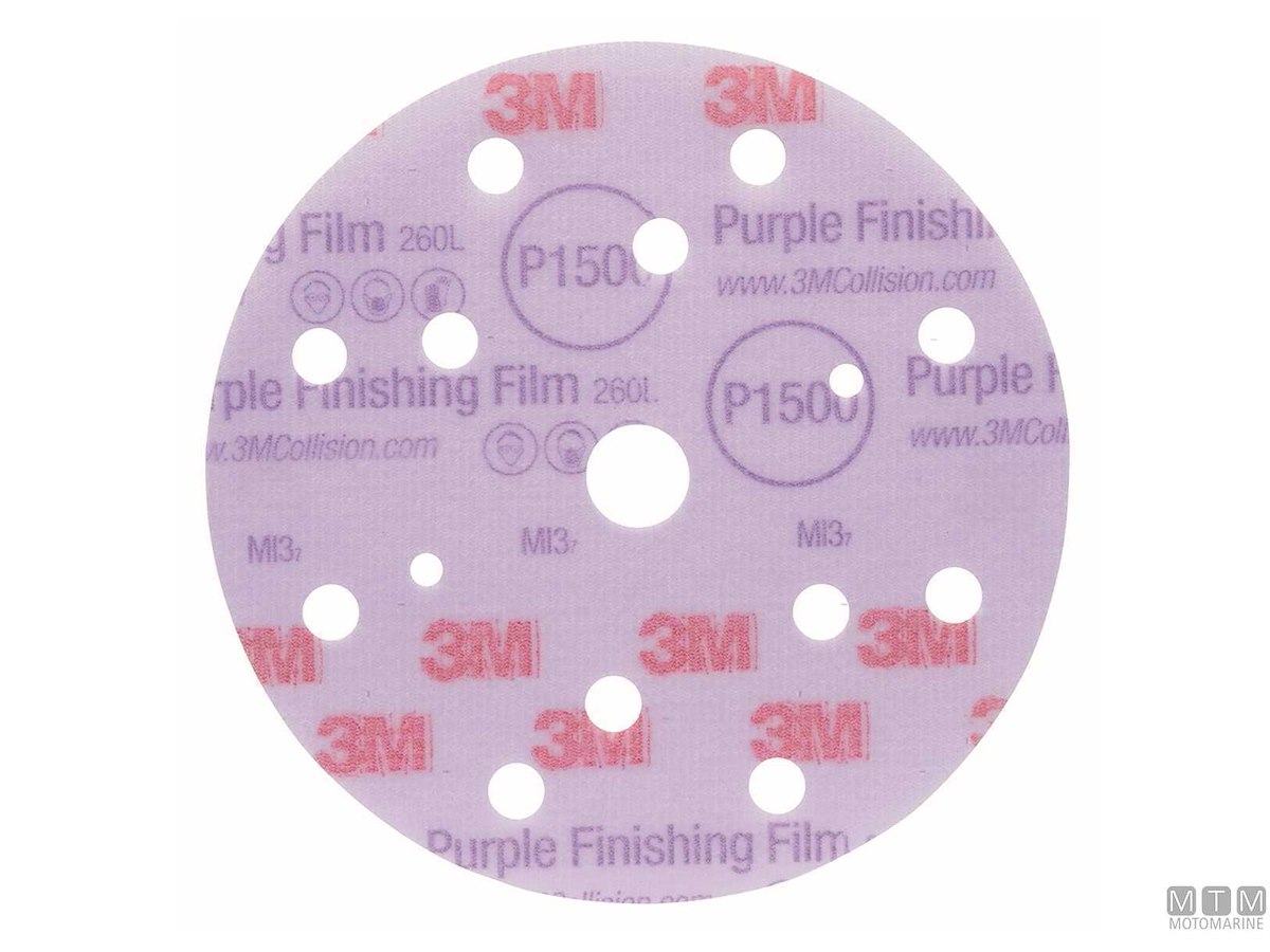 Dischi abrasivi da finitura 3M 260L 15 fori all'ossido di Alluminio ad alta prestazione con additivo antintasamento. Con legante a doppia resina e sistema di fissaggio a strappo Hookit. Ideali per le operazioni di finitura prima della lucidatura.