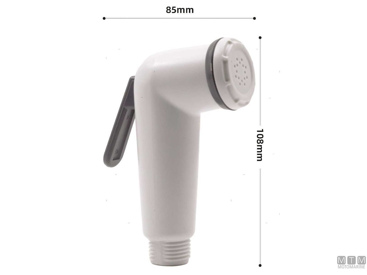Testa doccetta Alba in ABS antiurto bianca, con anello e levetta color antracite.Leva comando apri/chiudi e getto continuo. Attacco da 1/2".