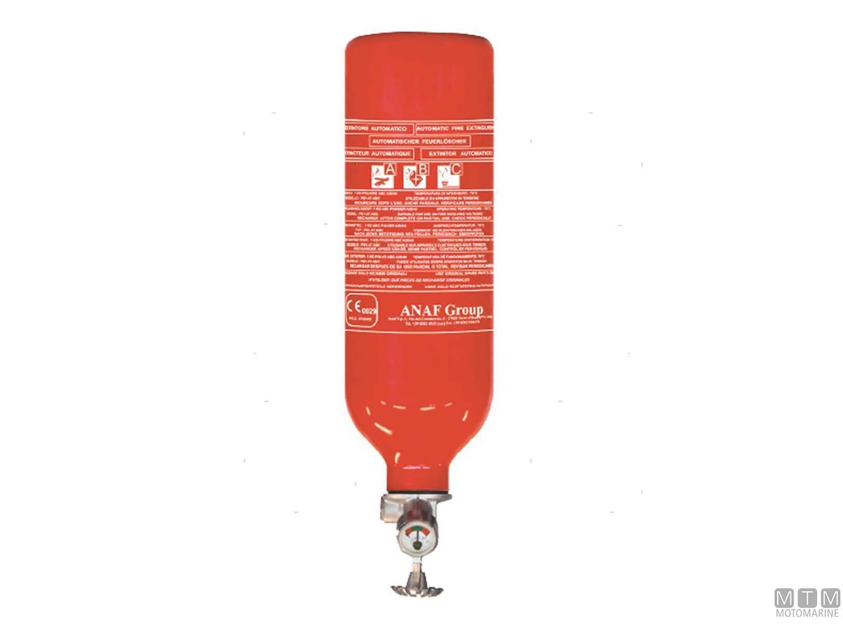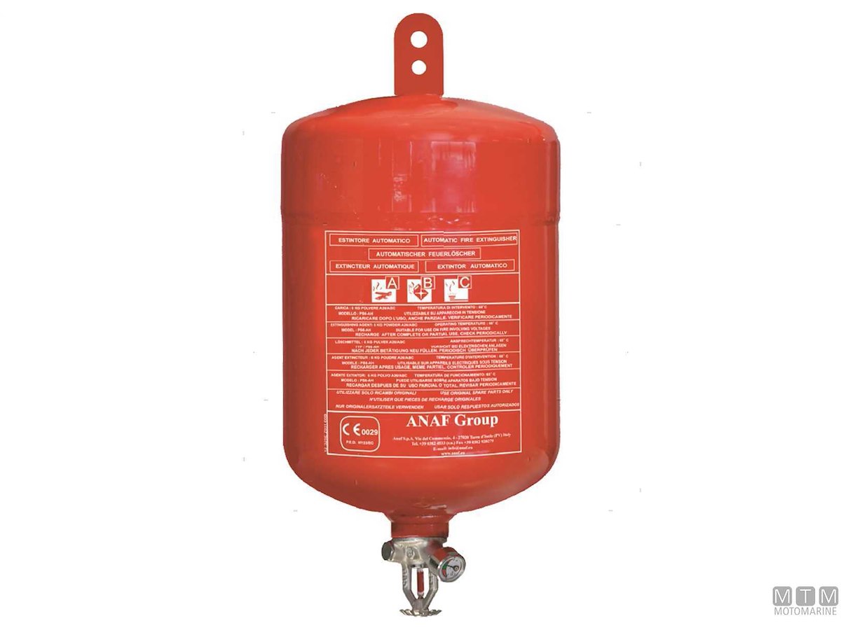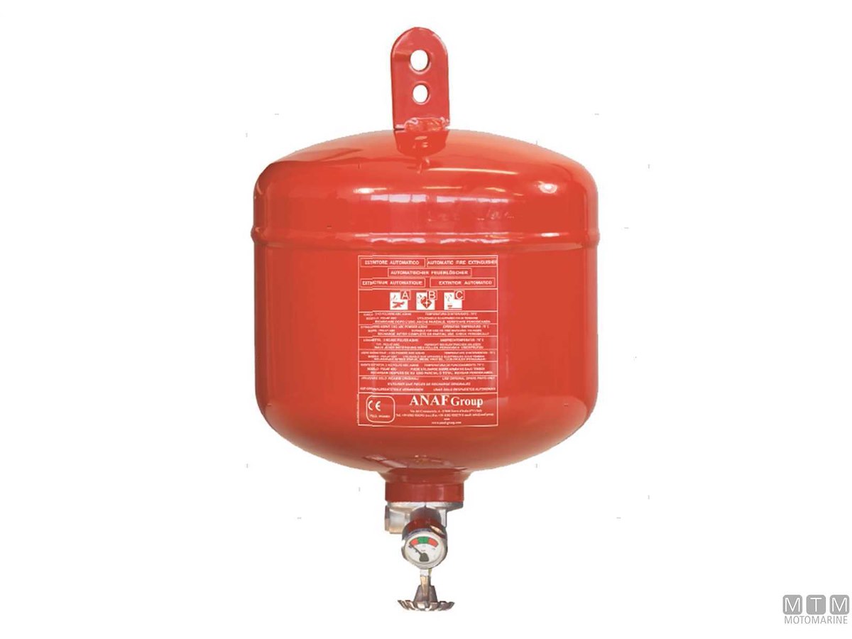Estintori automatici a polvere certificati CE con corpo in lega di Alluminio e manometro con indicazione di carica. Si attivano automaticamente con valvola Sprinkler a 68°C. Vengono venduti senza cartellino di scadenza (non necessario per natanti).  Per imbarcazioni il cartellino di scadenza va richiesto ad un manutentore di estintori in base alla data di produzione stampata sul corpo estintore.