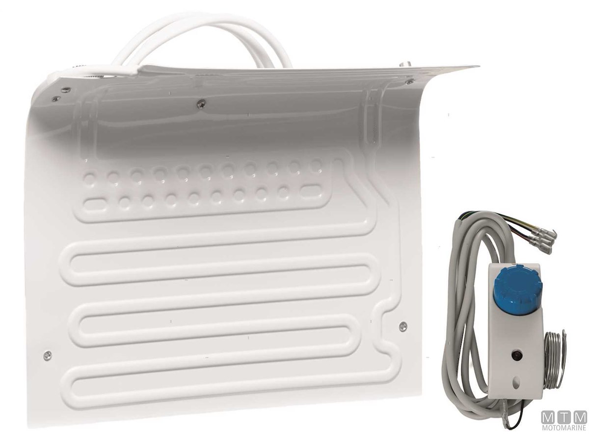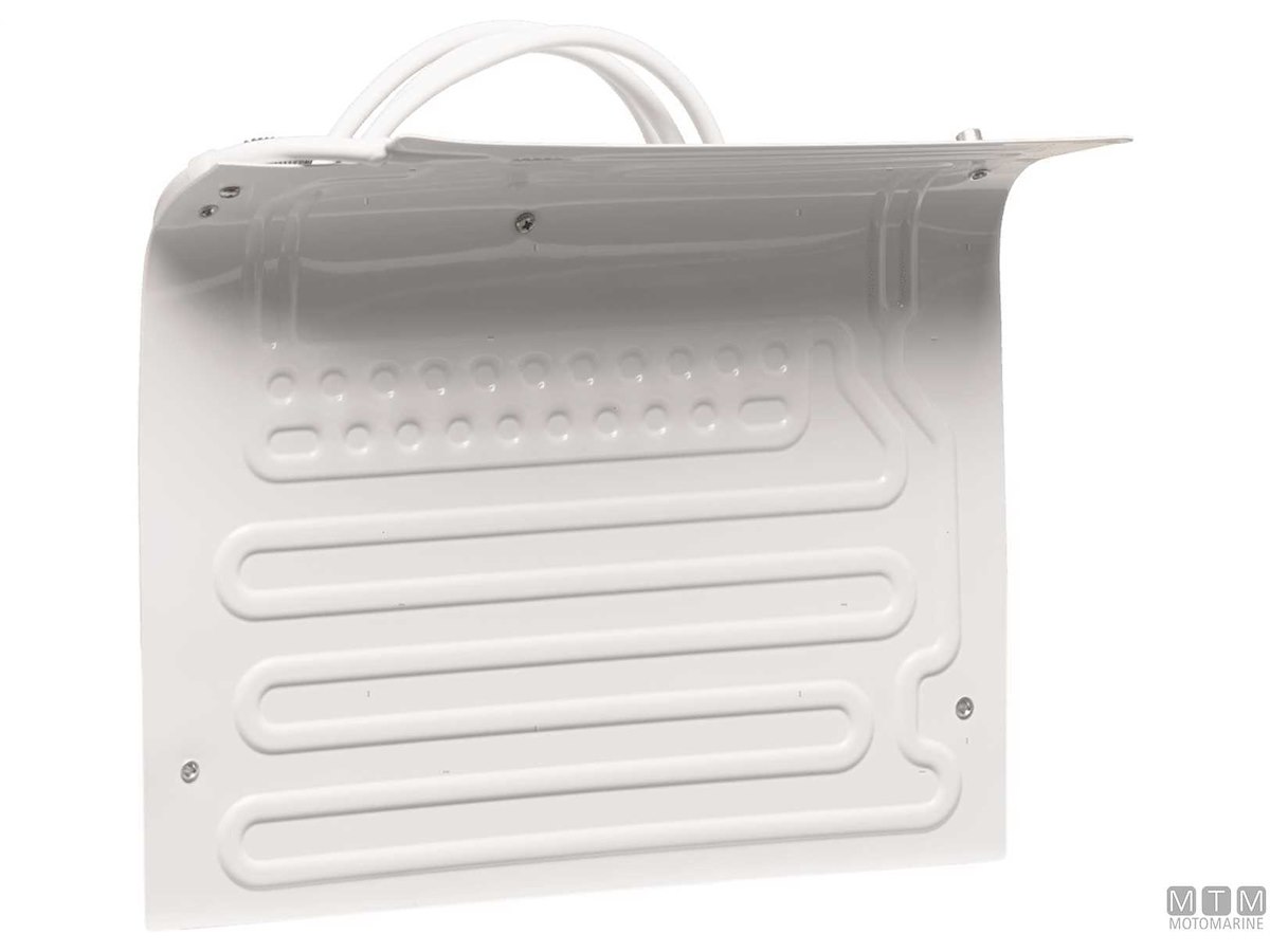 Evaporatore a L per gruppi refrigeranti della Serie 80. Capacità di raffreddamento: 170 Lt max (con isolamento in PU da 50 mm). Completo di termostato con spia LED e giunti rapidi tipo Dometic con valvola auto-sigillante.