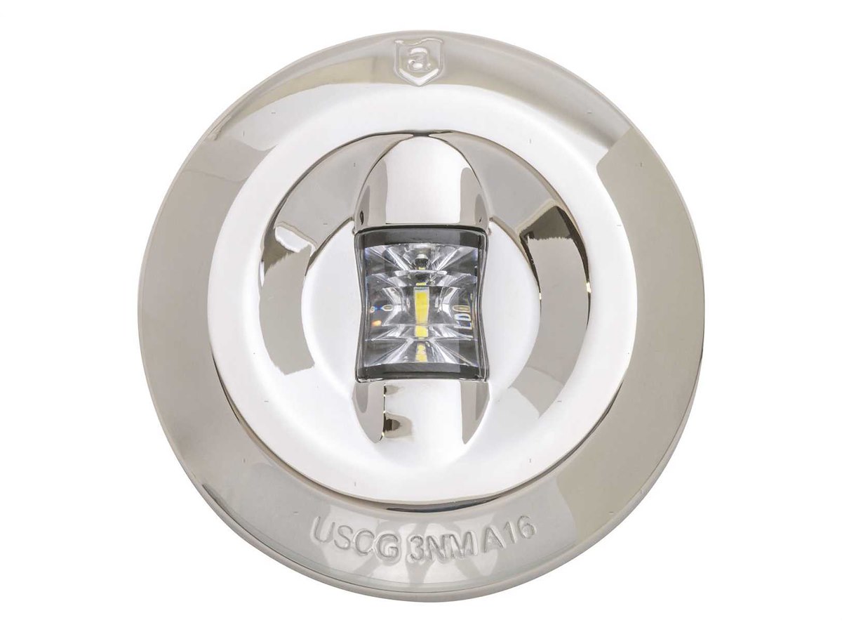 Fanale di navigazione di poppa LED Attwood in Acciaio Inox. Certificato CE-EN/ISO19009:2015, COLREG e ABYC per imbarcazioni fino a 50 metri, visibilità 3 miglia. Diametro 76 x H12,7 mm.