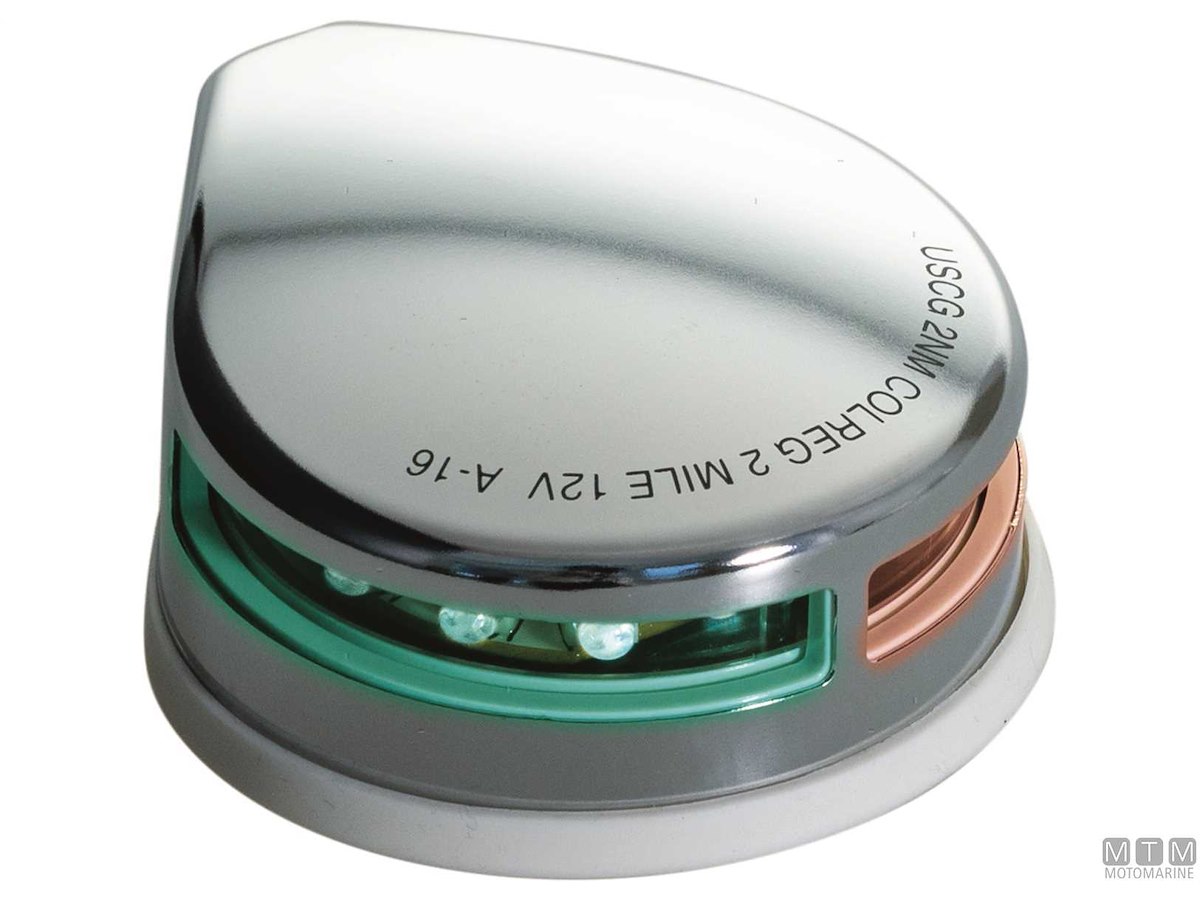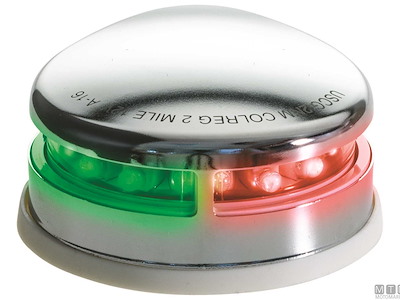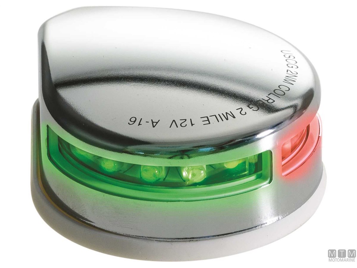 Fanale di prua bicolore 12V LED con cassa in Acciaio Inox e base in gomma.↵A normativa CE/USCG/COLREG/ABYC/NMMA.↵Dimensioni: 81 x 96 x H34 mm.
