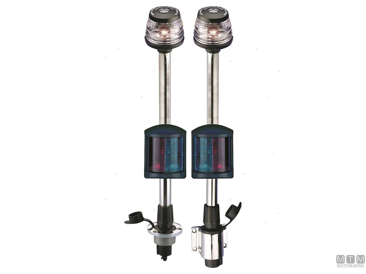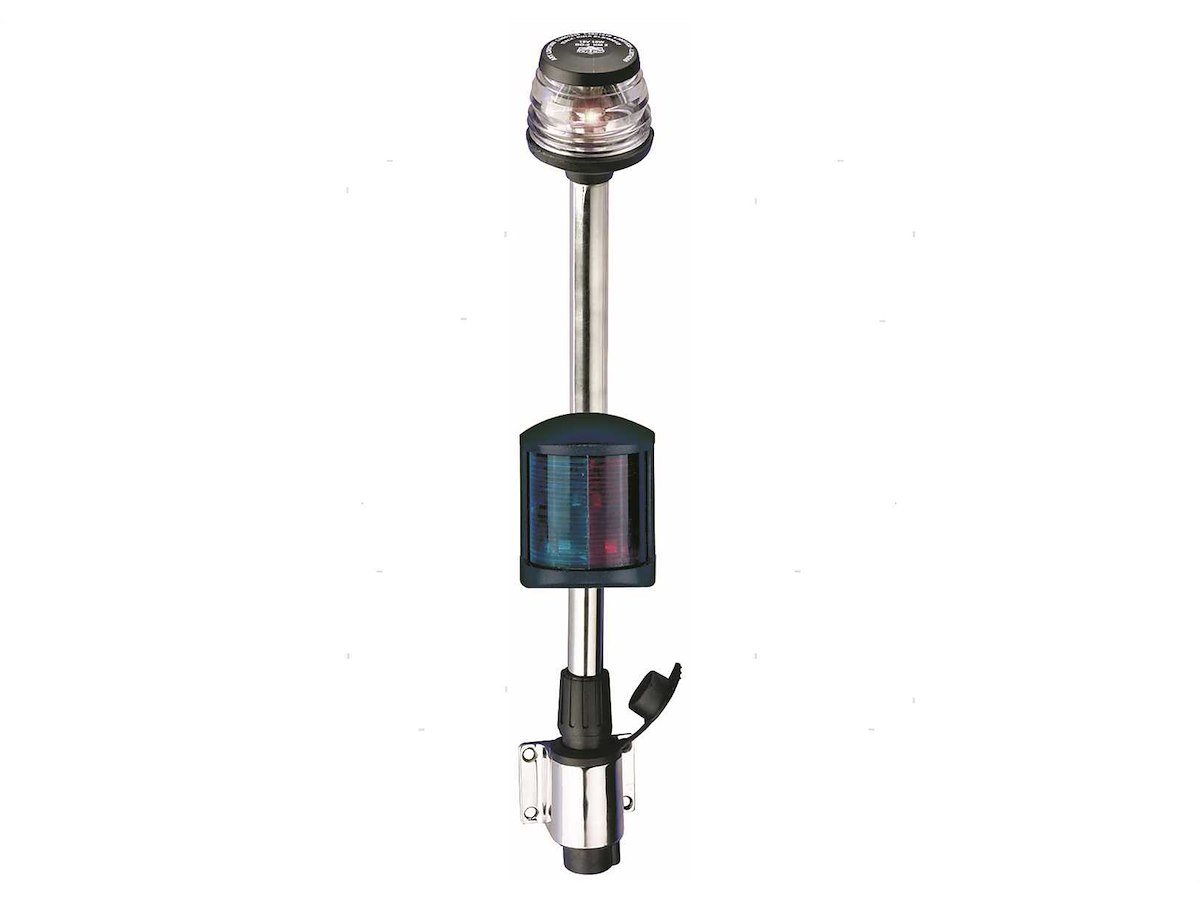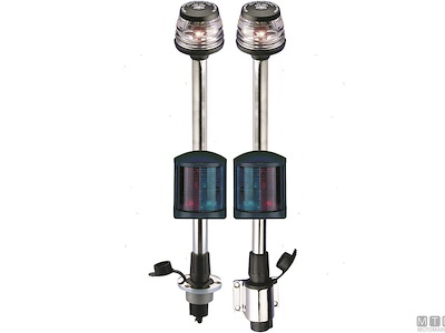 Fanale su asta estraibile in Acciaio Inox.↵Altezza 100cm. ↵2 fanali per 3 colori: Rosso/Verde 225° + Bianco 360°. ↵Per imbarcazioni fino a 20 metri.