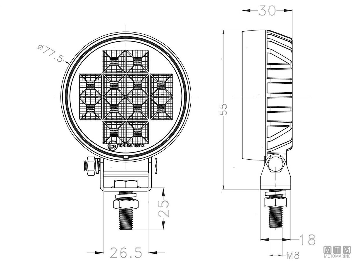 Voltaggio 9-32V. Potenza 16W. Lumen 1200. Luce bianca 6000°K.Completo di base in Acciaio Inox, guarnizione a frizione antivibrante e viteria Inox.