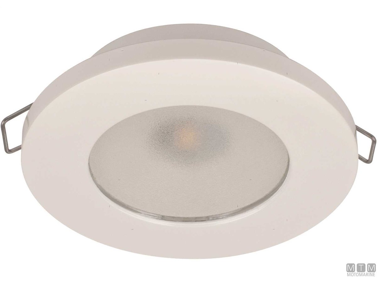 Faretto LED 2W IP40 per interni con cornice in composito bianco. Montaggio ad incasso con molle. Voltaggio universale 9-32V con LED dimmerabile protetto da picchi e inversione.