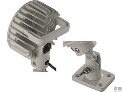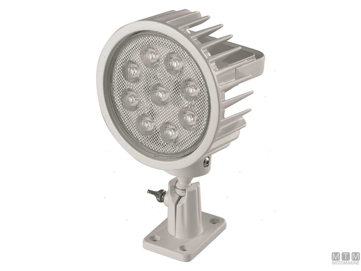Faro LED 10-30V orientabile impermeabile IP6X con maniglia e snodo sferico. Cassa in lega di Alluminio verniciato bianco con interruttore impermeabile integrato. Potenza 45W - Luminosità 4800 Lumen - Luce potente e diffusa.Diametro 125 mm - Altezza totale 210 mm - Base 50x70 mm.