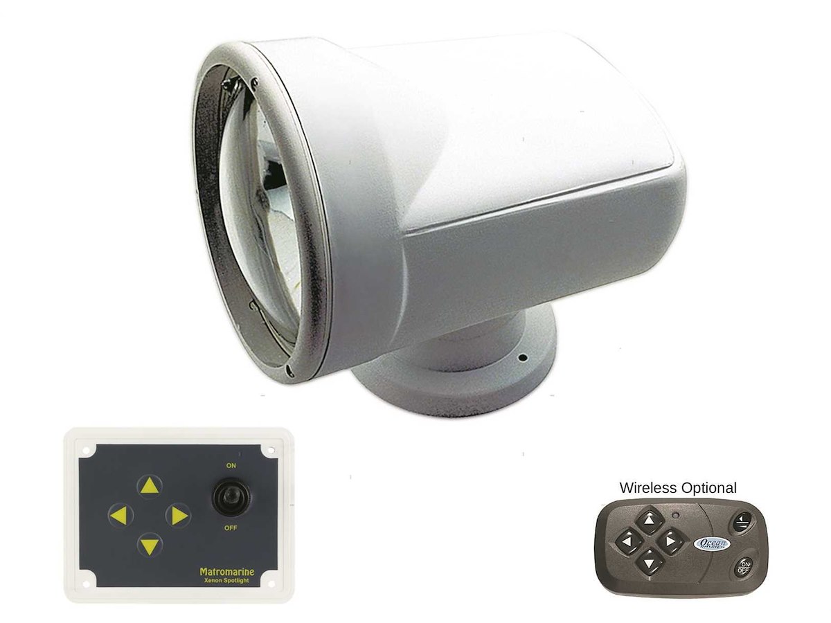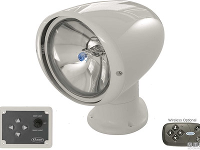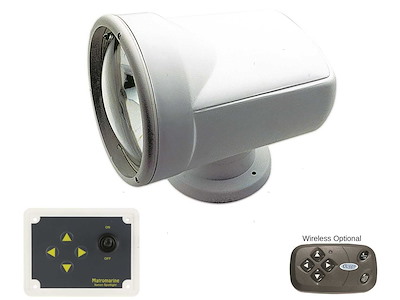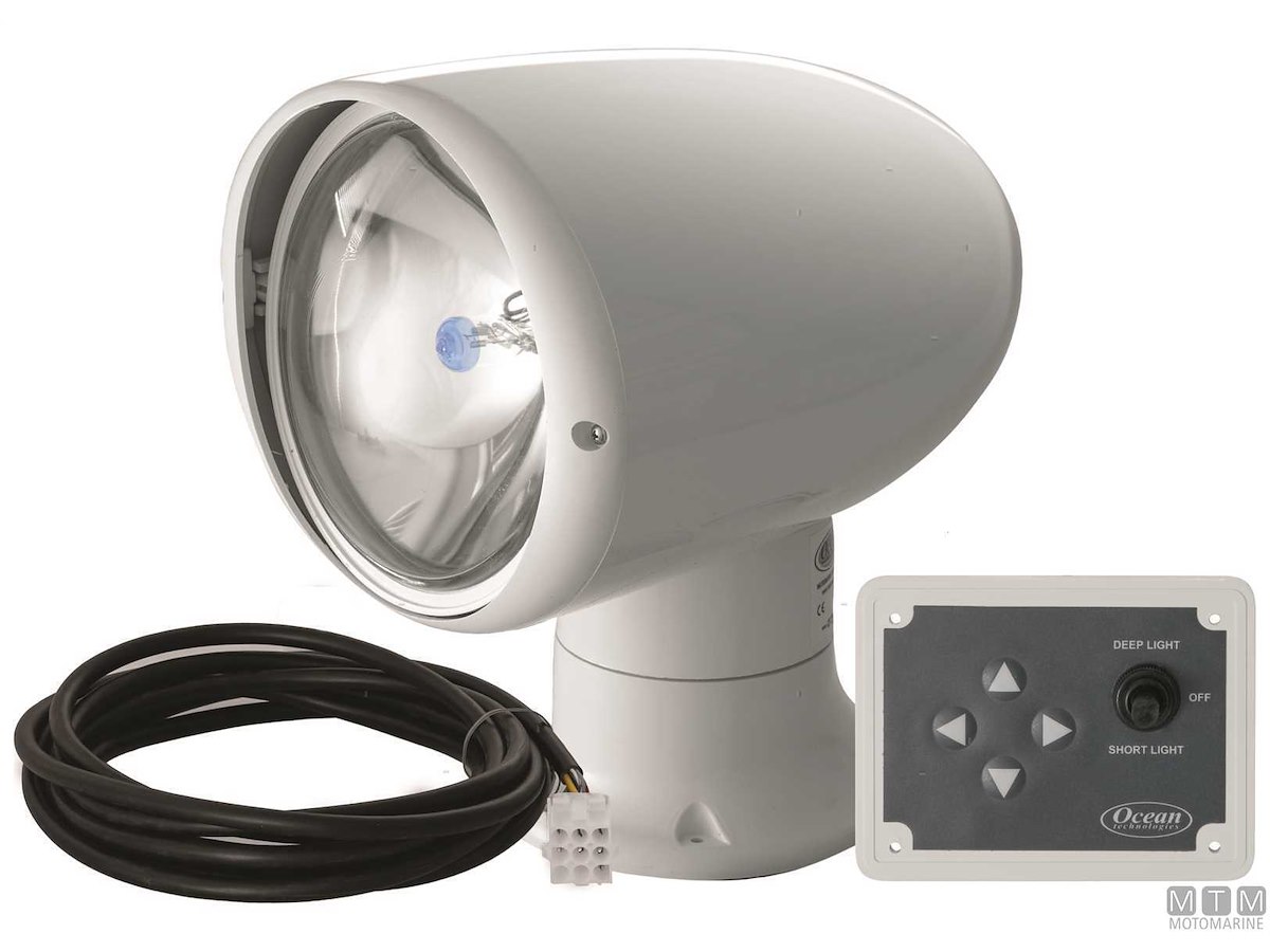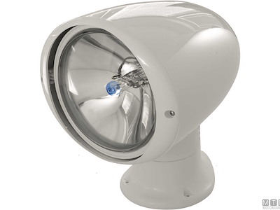 Faro orientabile con pannello di controllo impermeabile e cavo da 4 m. Cassa in Polimero antiurto resistente raggi UV. Bulbo alogeno H3 stagno dia 140 mm con fascio di luce a due modalità: diffusa e profonda.  Comando wireless opzionale con ricevitore e trasmettitore plug and play fino a 35 m. Se installato, sostituisce il pannello controllo cablato. Per mantenere entrambi, è necessario acquistare il pannello doppia stazione.  Dimensioni faro 220 x 190 x H245 mm, base 120 x 150 mm. Dimensioni pannello 92 x 122 mm, incasso 60 x 90 x H45 mm.