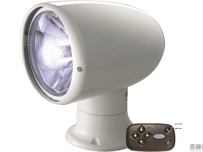 Faro LED orientabile wireless con corpo stagno in polimero antiurto resistente raggi UV. Completo di radiocomando tascabile e ricevitore plug and play fino a 35m. Con due modalità di fascio luce, diffusa e profonda. Dimensioni 230 x 185 x H210 mm, consumo 25/15W (12/24V)