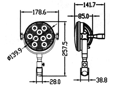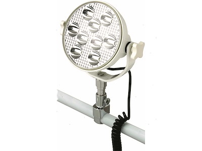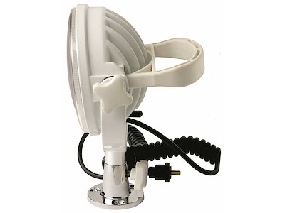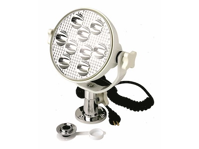 Faro impermeabile orientabile Power-LED in lega di Alluminio resistente alla corrosione con base estraibile e maniglia. Voltaggio universale 12/24V. Consumo ridotto solo 20W. Morsetto opzionale per attacco su tubo.