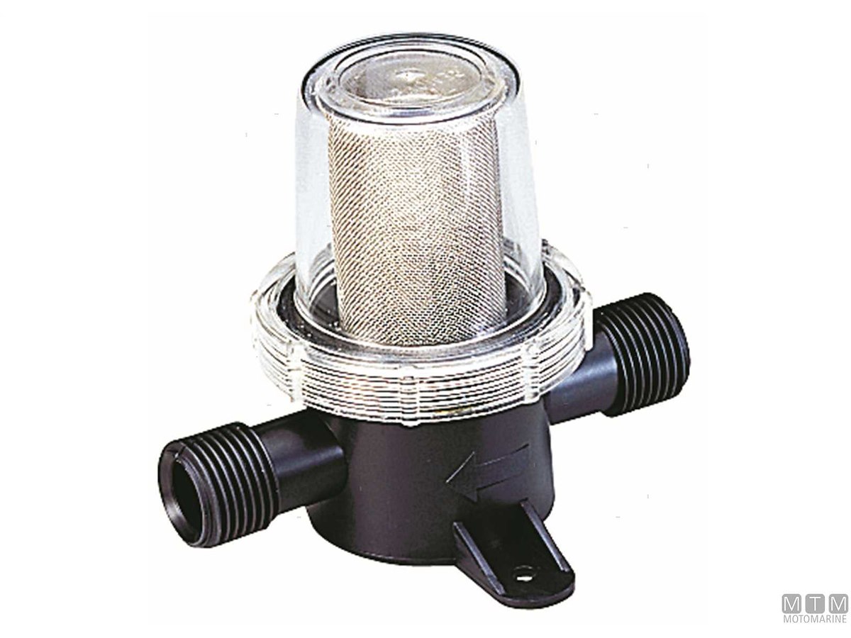 Filtro per acqua sanitaria con filtrante in Acciaio Inox. Non potabilizza l'acqua, ma trattiene le impurità. Raccordi entrata-uscita filettati.