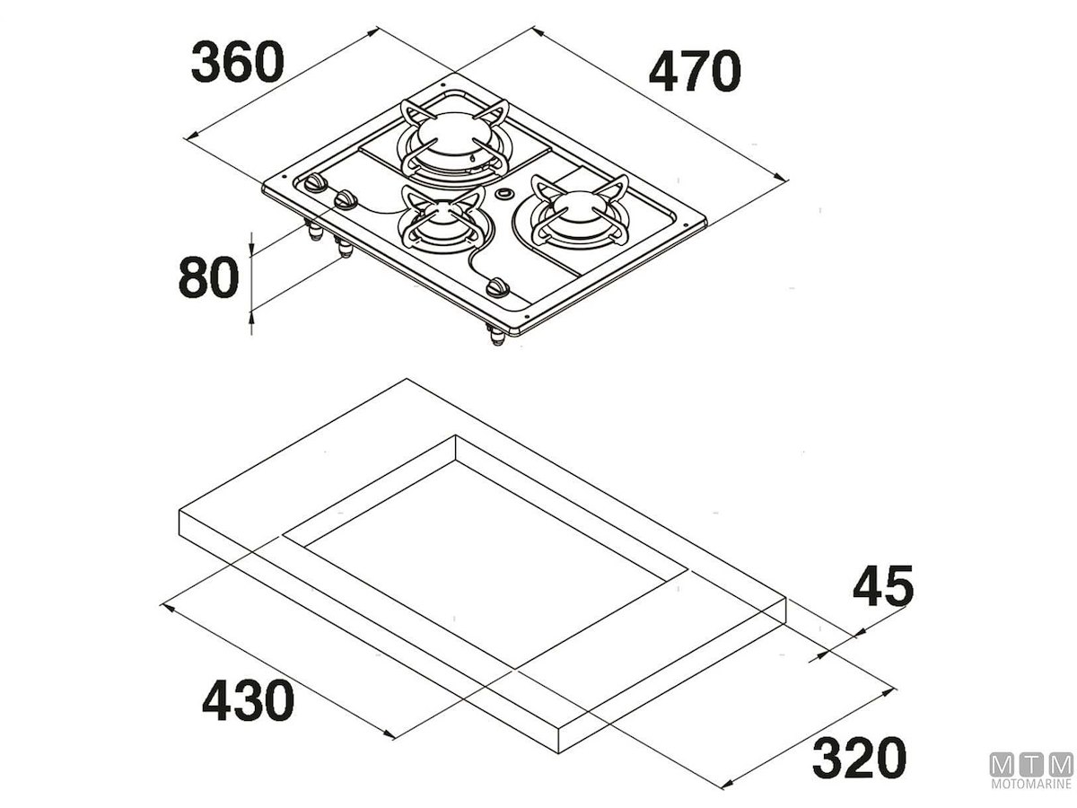 Fornello a incasso a 3 fuochi con piano in Acciaio Inox lucido e termosicurezze. Dimensioni incasso: 430 x 320 x H80 mm.
