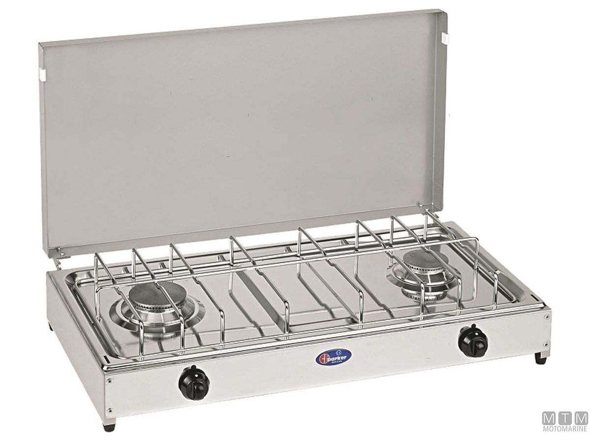Fornello ad appoggio con coperchio e piano in Acciaio Inox. Completo di termocoppie di sicurezza, bruciatori in lega Pyral, spartifiamma in Ottone stampato e griglia continua in Acciaio Cromato. Potenza bruciatori 1500/2000W.