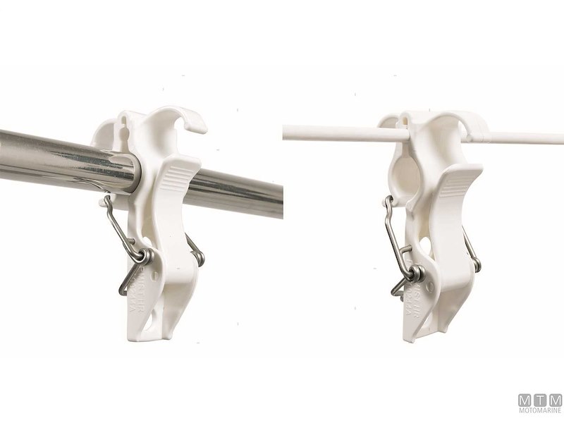 Gancio fissa parabordi in Nylon con molla di sicurezza in Acciaio Inox.Per fissare i parabordi su battagliole da 22 a 25 mm oppure draglie da 6 a 9 mm.Leva GRIP per la regolazione in altezza del parabordo e maniglia passadito per un facile e veloce cambio di posizione.
