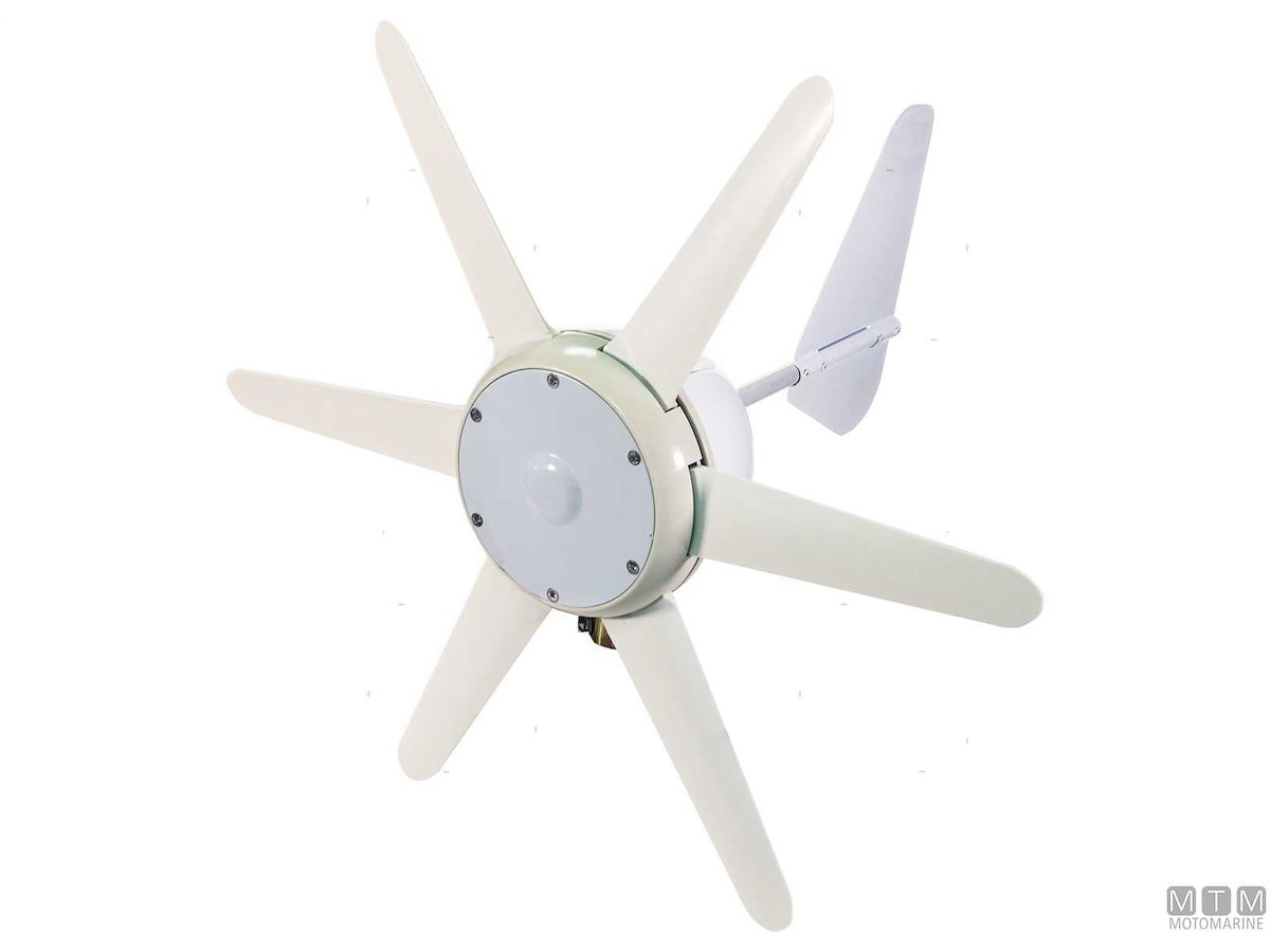 Generatore eolico 12V, completo di controller di tensione integrato grazie al quale lo si può collegare direttamente alla batteria. Potenza in uscita 90 Watt a pieno regime. 6 pale in fibra di vetro rinforzata e corpo in plastica resistente all'acqua IP65. Intervallo funzionamento vento: 3,6 km/h - 120 km/h. Da montare su tubo da 45 mm.