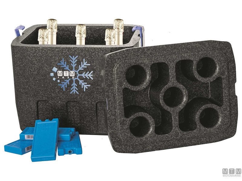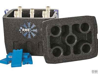 Ghiacciaia portatile molto leggera ad alte prestazioni progettata per contenere fino a 5 bottiglie da servire a temperatura ideale. Costruita con innovativo materiale EPS che garantisce una resistenza e un isolamento eccezionali a costo ridotto. Con l'aggiunta di panetti di ghiaccio inclusi con la ghiacciaia si riesce a mantenere la temperatura per 12 ore perdendo solo un grado. Completa con sistema di chiusura a gancio e tracolla regolabile.