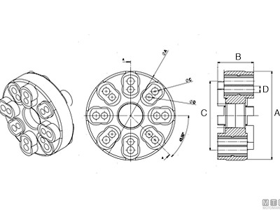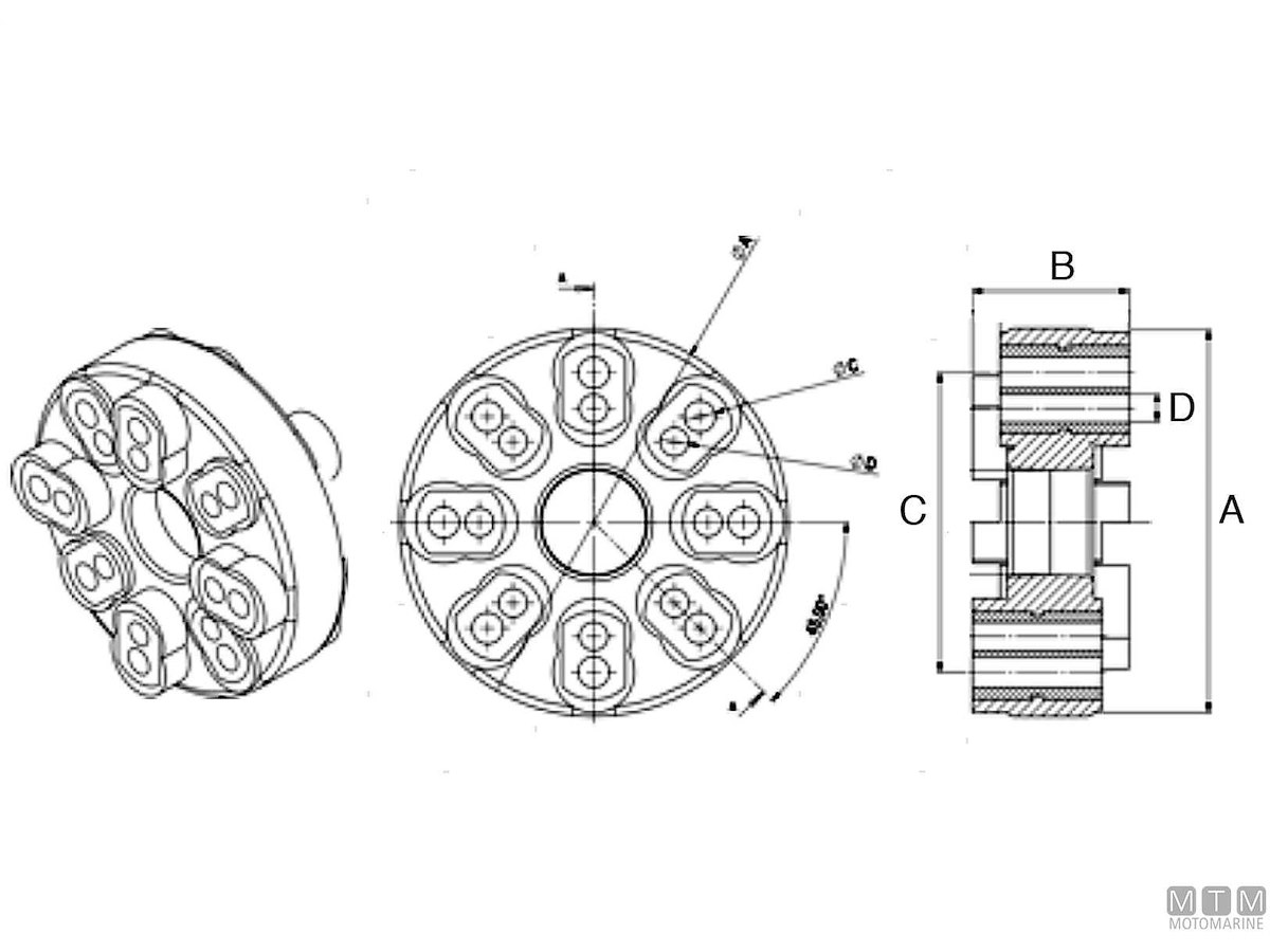 Giunto elastico 16 fori per flange di accoppiamento tra asse elica e invertitore. Cod.: 4820208 A mm: 140 B mm: 50 C mm: 82,5 / 96,0 D mm: 10,2