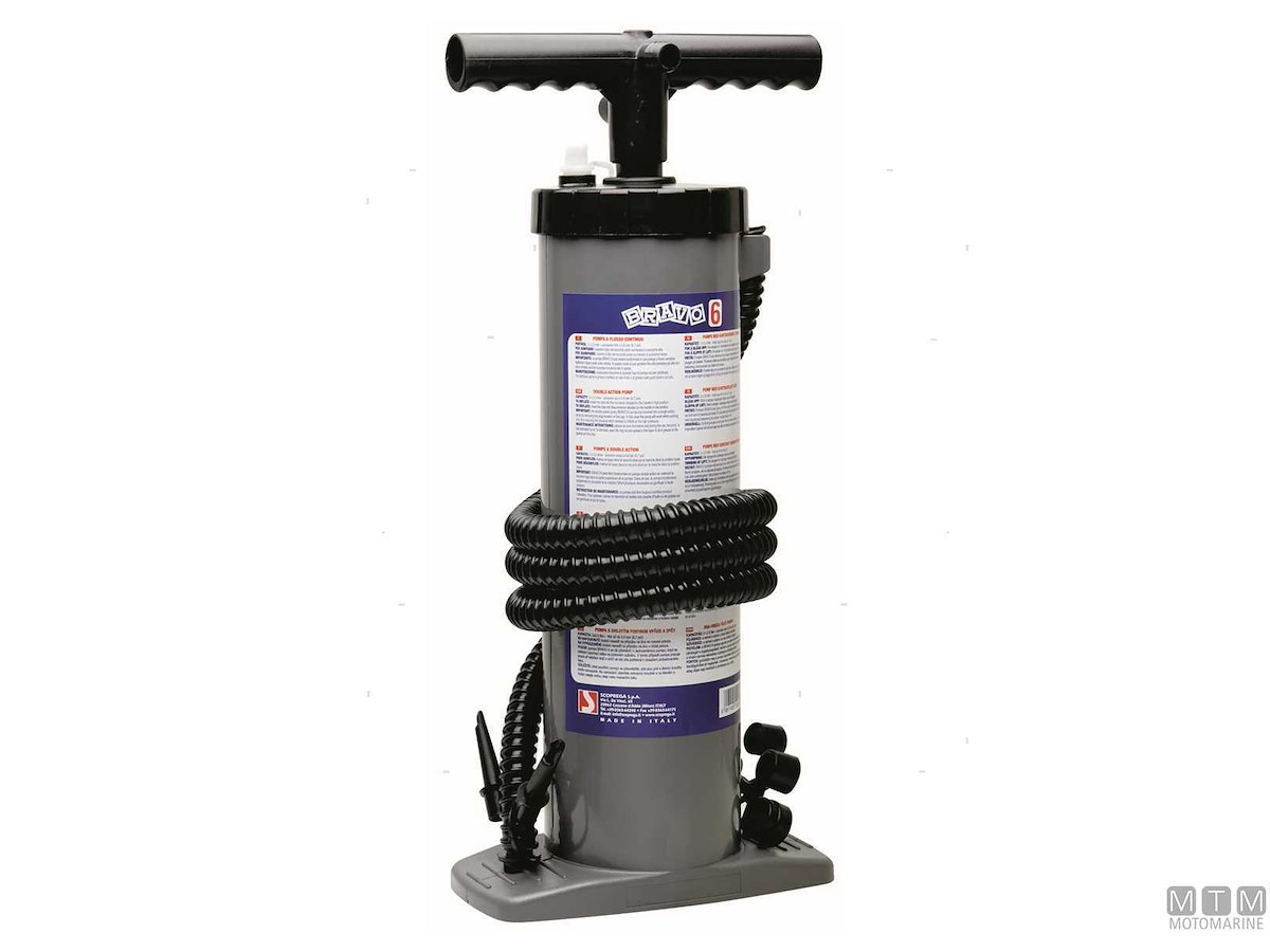 Gonfiatore a mano doppio flusso Bravo 6 con raccordi multipli. Tramite un tappo può diventare a flusso semplice per gonfiare alla massima pressione senza sforzo. Dimensioni 21 x 12 x H47 cm.