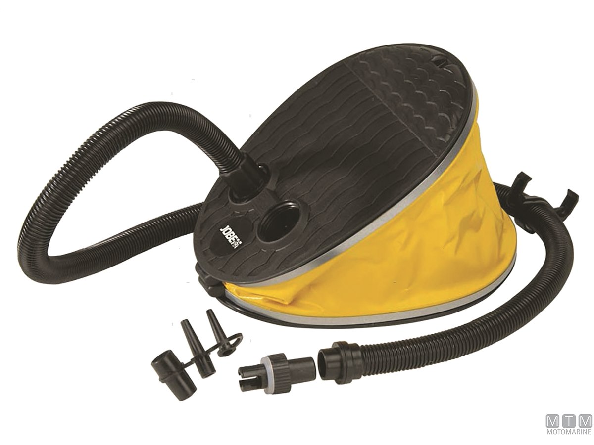 Gonfiatore a pedale Jobe da 2000 cc con un set di 4 ugelli per adattarsi a gommoni, SUP, ski tubes e materassi ad aria e alla maggior parte degli altri articoli gonfiabili. Completo di valvola Halkey Roberts.