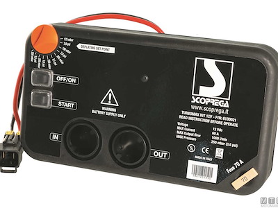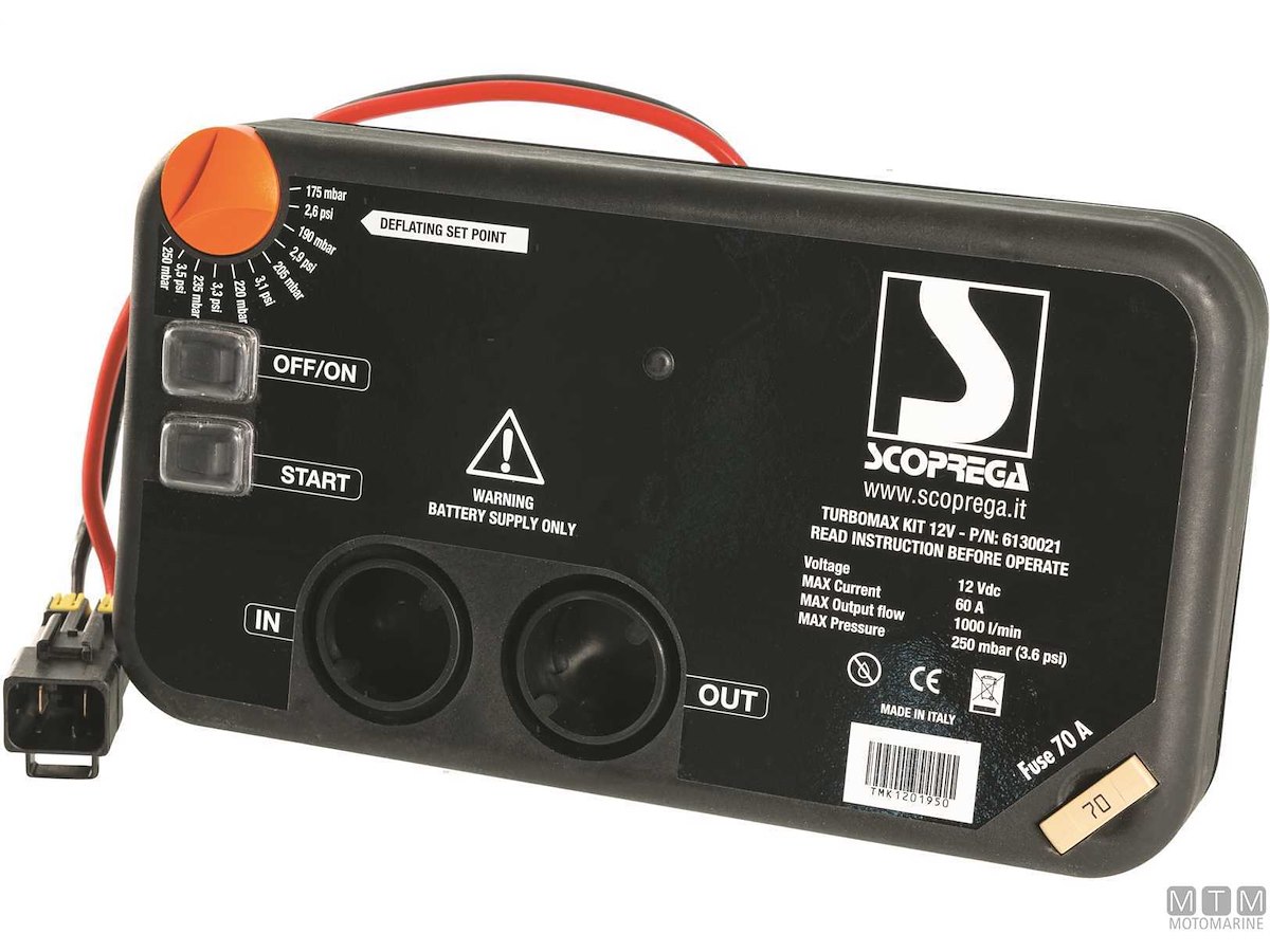 Gonfiatore a installazione fissa Turbo Max Kit con arresto automatico alla pressione impostata. Può gonfiare e sgonfiare un battello pneumatico da 7 metri in 7 minuti.Completo di staffe per il fissaggio, viti e cavo alimentazione da 0,5 metri.Dispone di un driver digitale con tecnologie DSP e MOSFET, controllo a LED integrato e offre versioni sia a 12V che a 24V su richiesta. Dimensioni: 30 x 16 x 7 cm, consumo massimo 60A.
