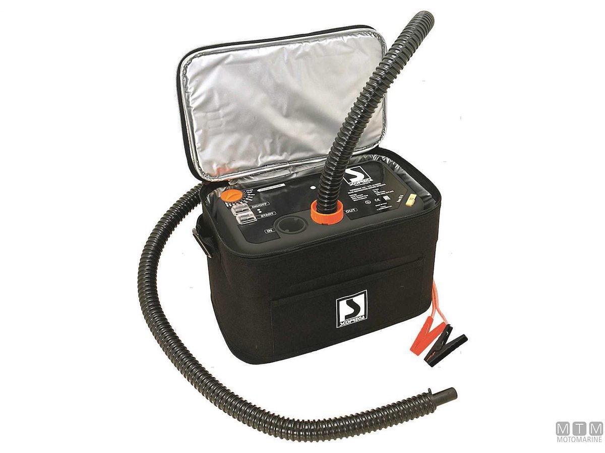 Gonfiatore elettrico 12V Turbo Max ad alta velocità con arresto automatico a pressione raggiunta. Può gonfiare o sgonfiare un gommone da 7 metri in 7 minuti. Completo di cavo alimentazione da 1,7 metri, tubo aria da 2,8 metri, fusibile di sicurezza e borsa con tracolla. Consumo massimo 60A. Dimensioni: 31 x 18 x H19 cm.