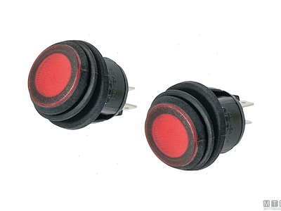 Interruttori basculanti 12V con luce di funzione LED. Impermeabili IP65, diametro incasso 20 mm.
