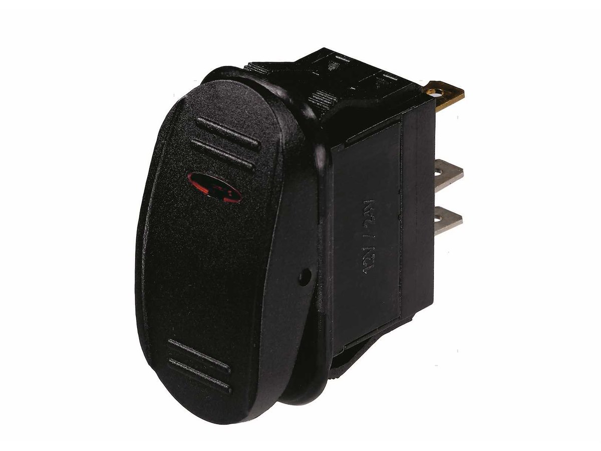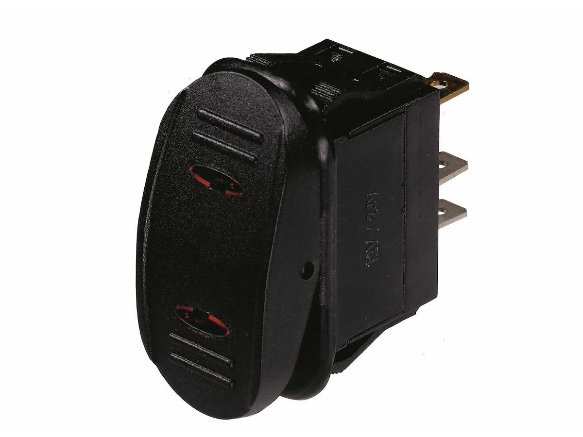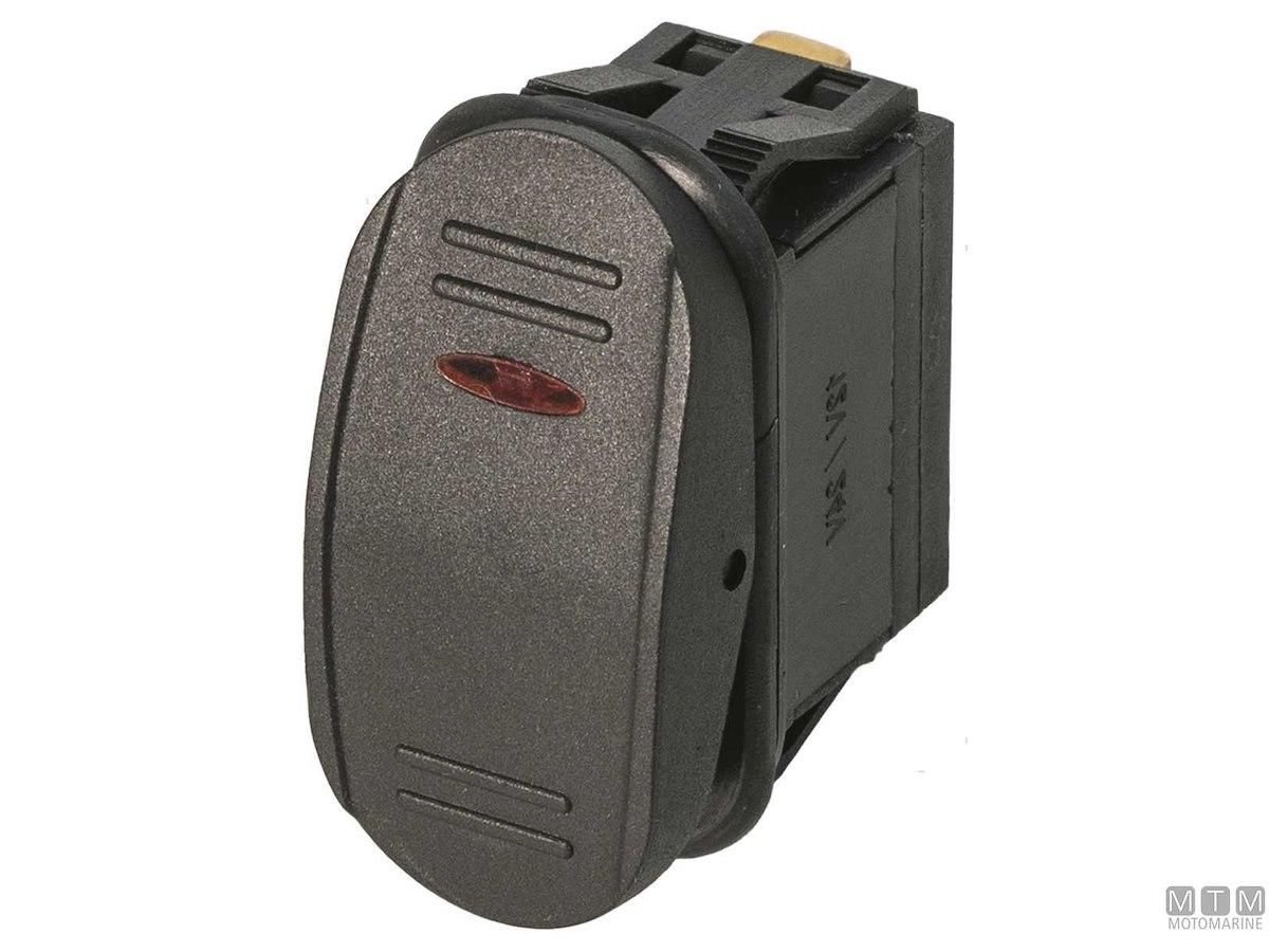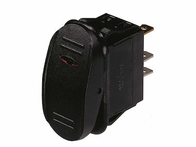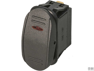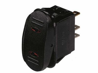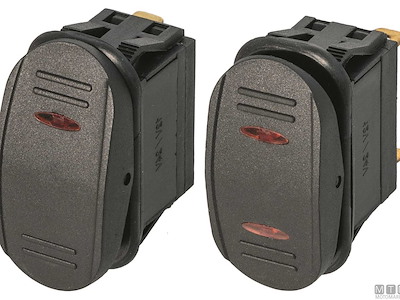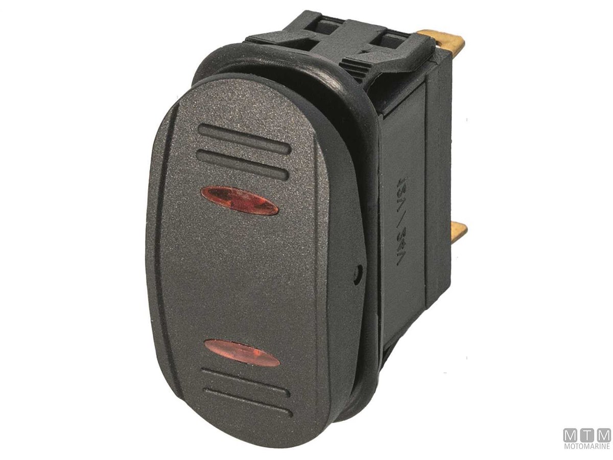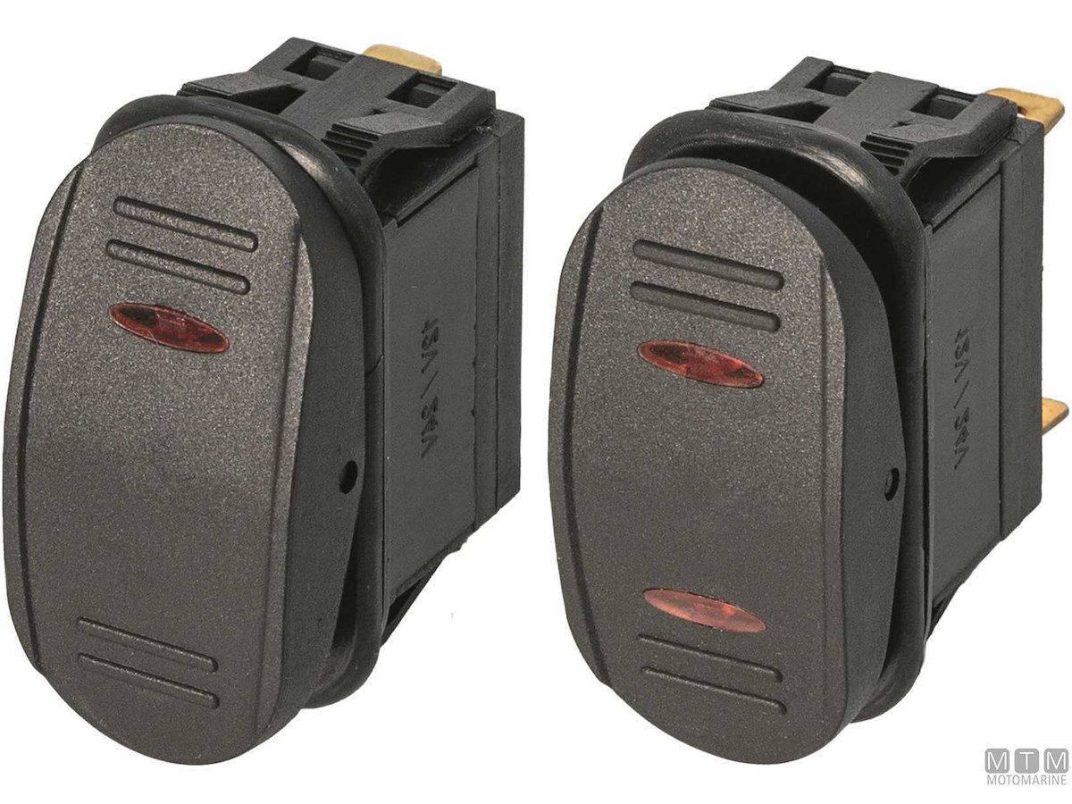 Interruttori basculanti impermeabili con luci pilota. On tra parentesi (On) indica una posizione momentanea. Cod.: 2100862 n° Terminali: 5 Capacità A: 15 Funzione: On-Off-(On) Luce: 2 ROSSE
