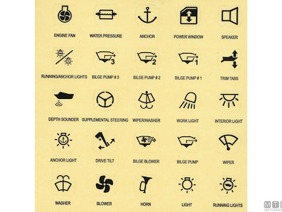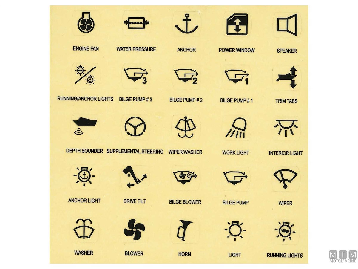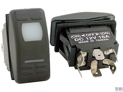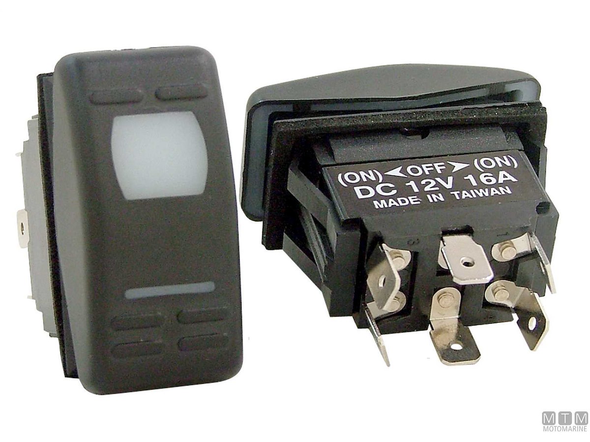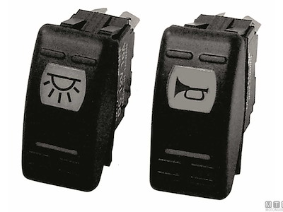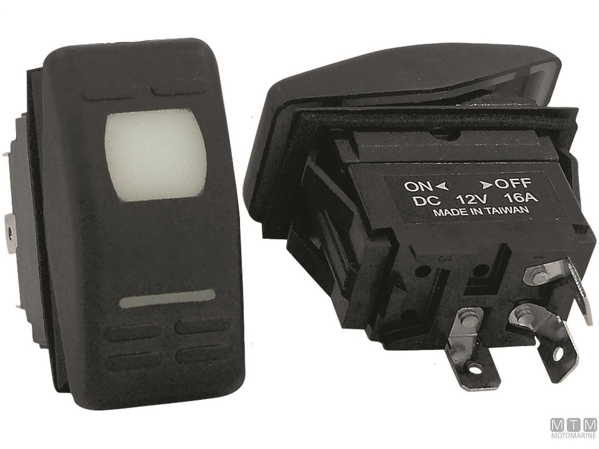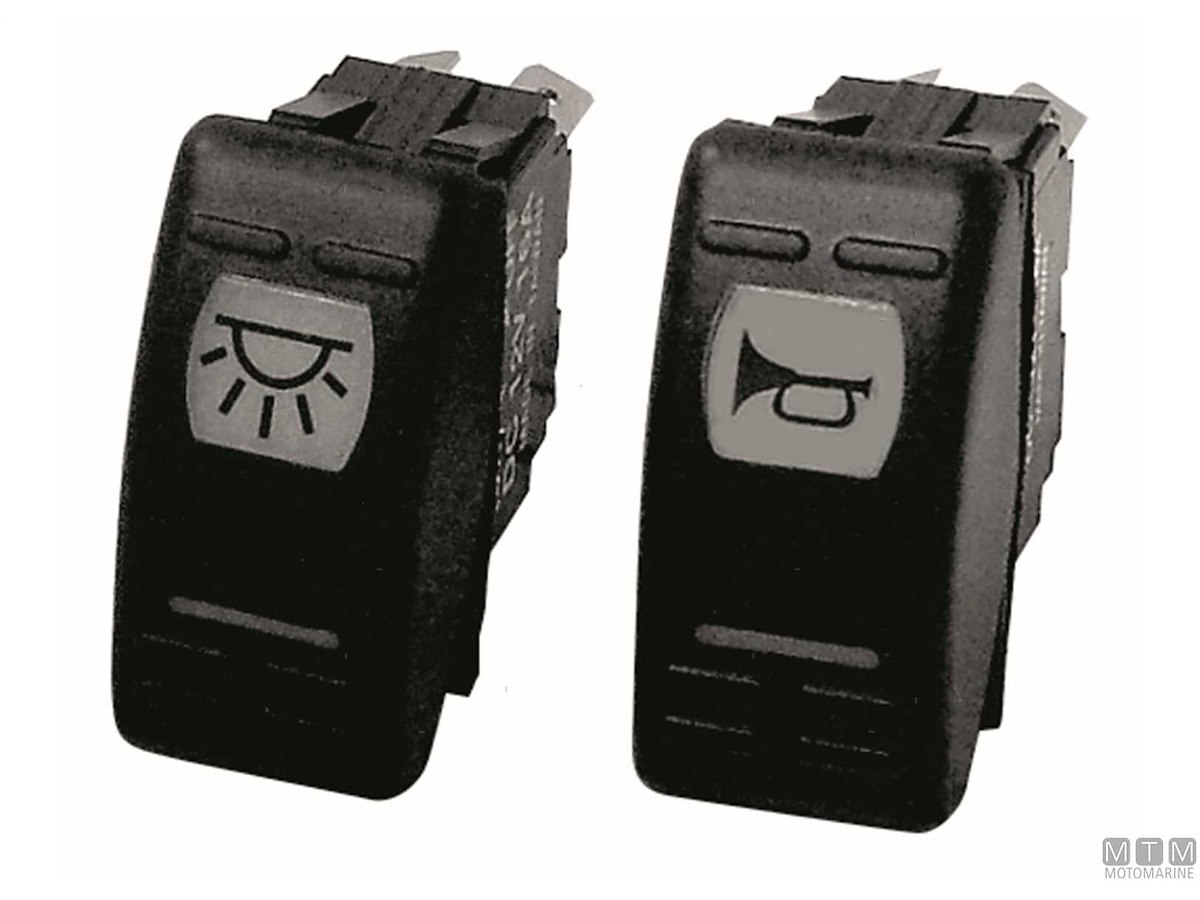 Interruttori basculanti 12V-15A in polimero IP55, completi di luce LED e etichette.