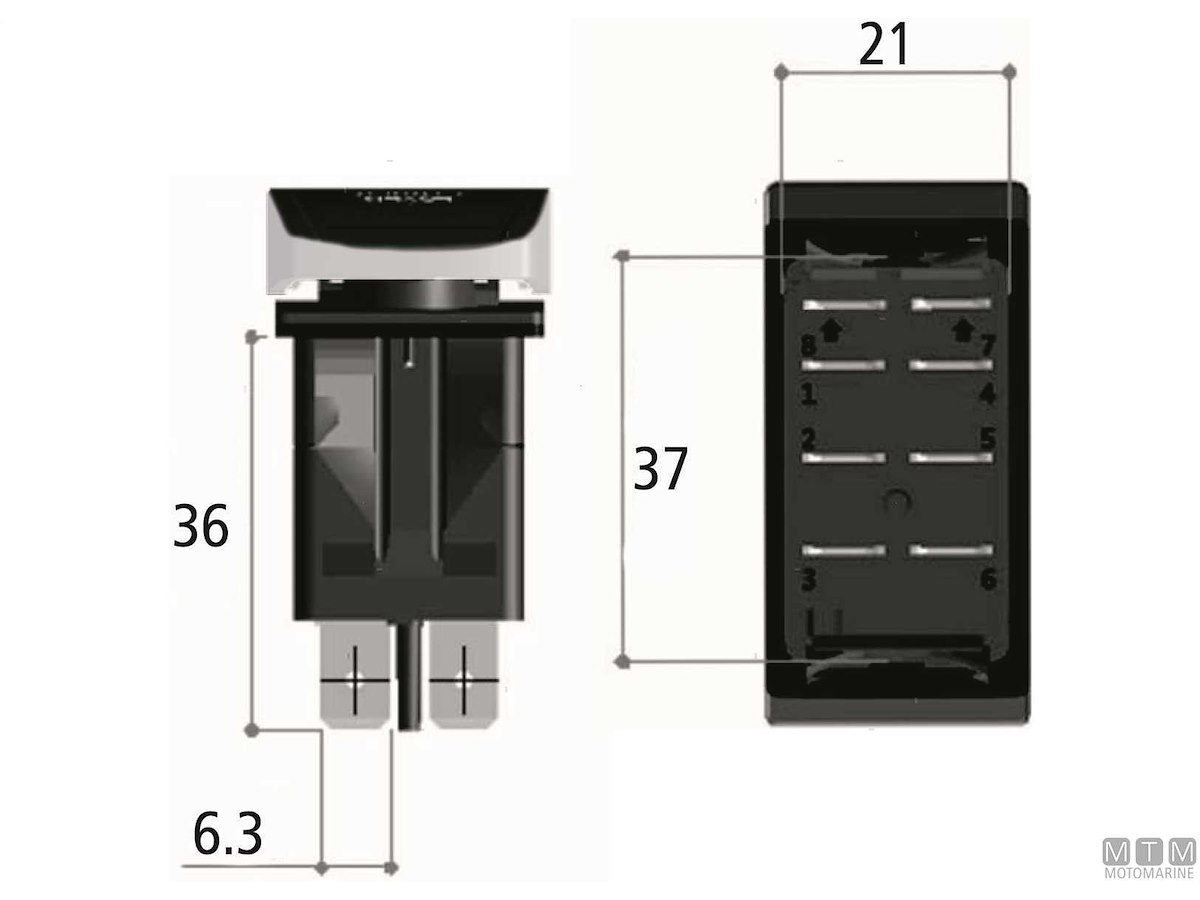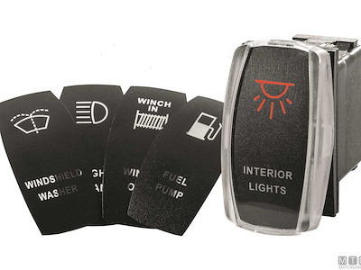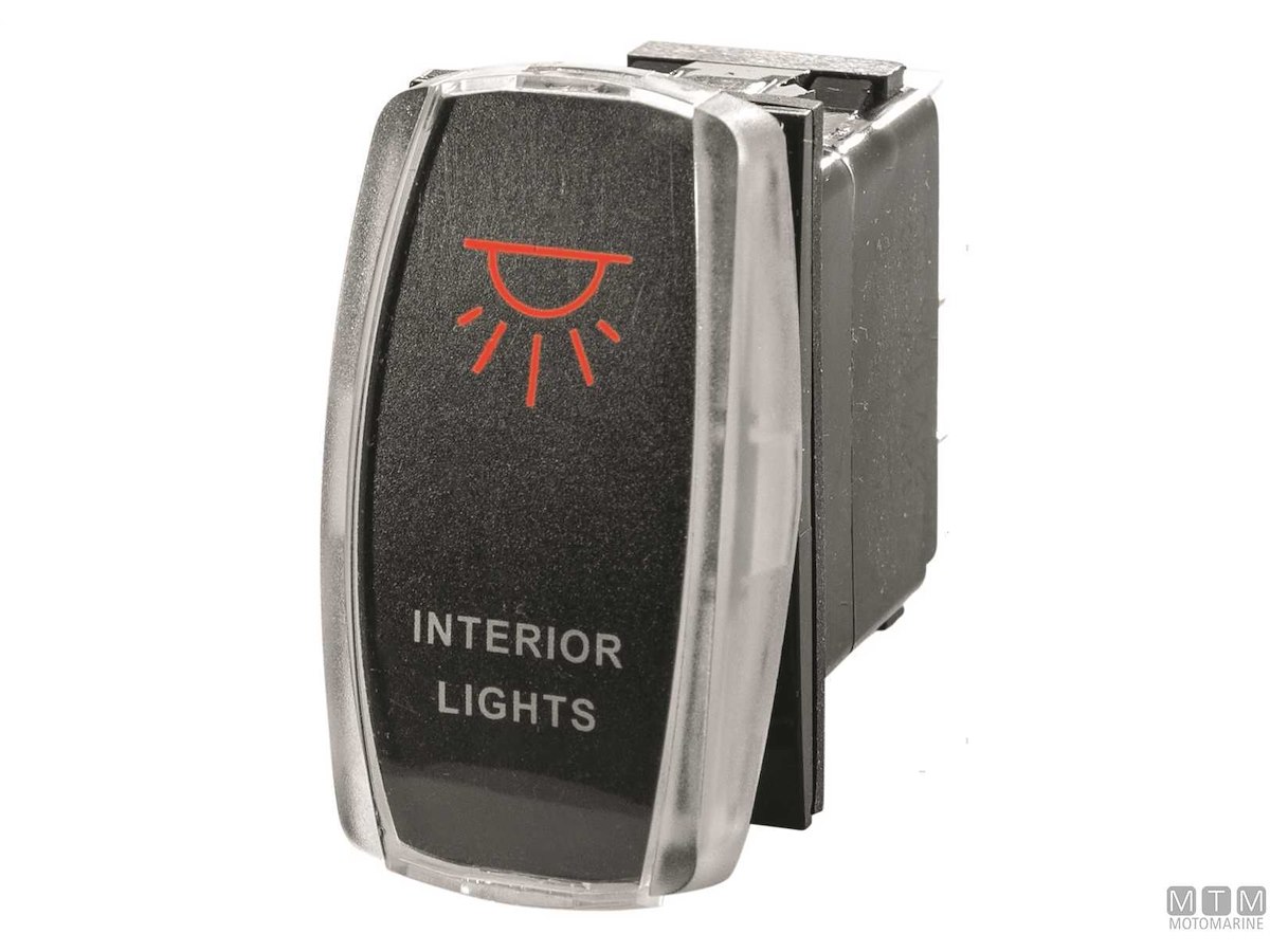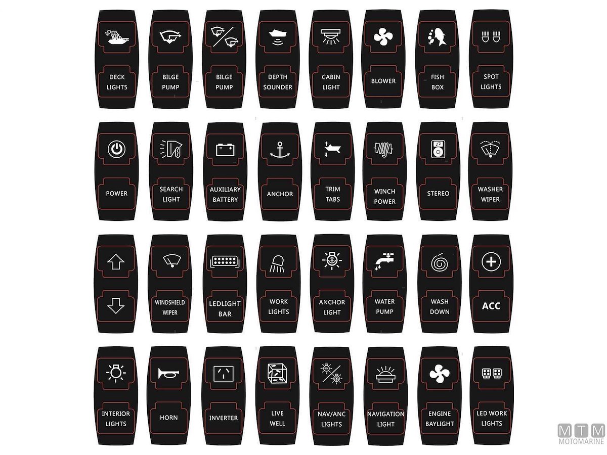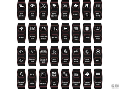 Interruttore basculante impermeabile IP68 con guarnizione in Nitrile. Completo con set da 32 etichette intercambiabili da inserire ad incastro sotto la bascula. Il simbolo dell'utenza è sempre illuminato (LED rosso), il testo descrittivo si illumina (LED bianco) quando l'interruttore viene azionato. Circuito bipolare 12/24V-20A.