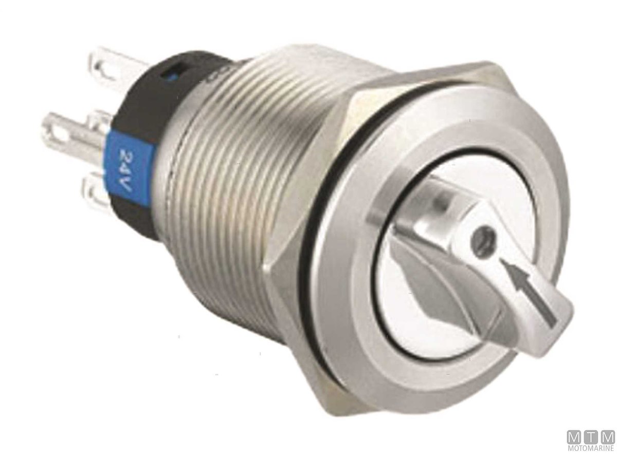 Interruttore con selettore rotativo 12V impermeabile IP67 con luce LED e corpo in Acciaio Inox. Montaggio a filo con foro da 19 mm. Altezza incasso 38 mm.