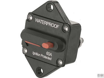 Interruttore magnetotermico a incasso per impiego nautico. Doppia funzione di interruttore e di protezione termica. Impermeabile IP67 non scarica scintille e può essere utilizzato su imbarcazioni con motori a benzina.