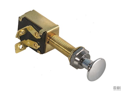 Interruttore con corpo in Ottone e pulsante a tiretto in Ottone Cromato. Due terminali per 1 circuito. Foro da 9 mm, altezza incasso max 55 mm.