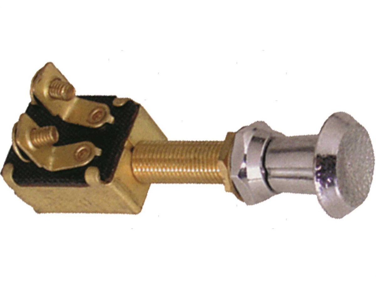 Interruttore a tiretto in Ottone con pomello in Plastica Cromata. 2 Poli per 1 circuito. Cod.: 2101500n° Terminali: 2Capacità A: 10Funzione: Off-On