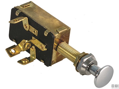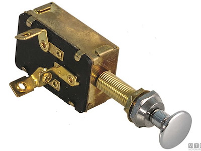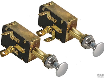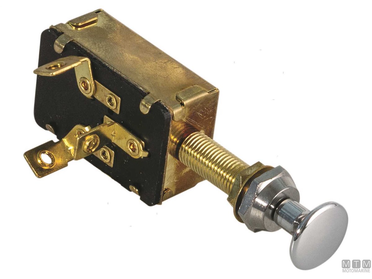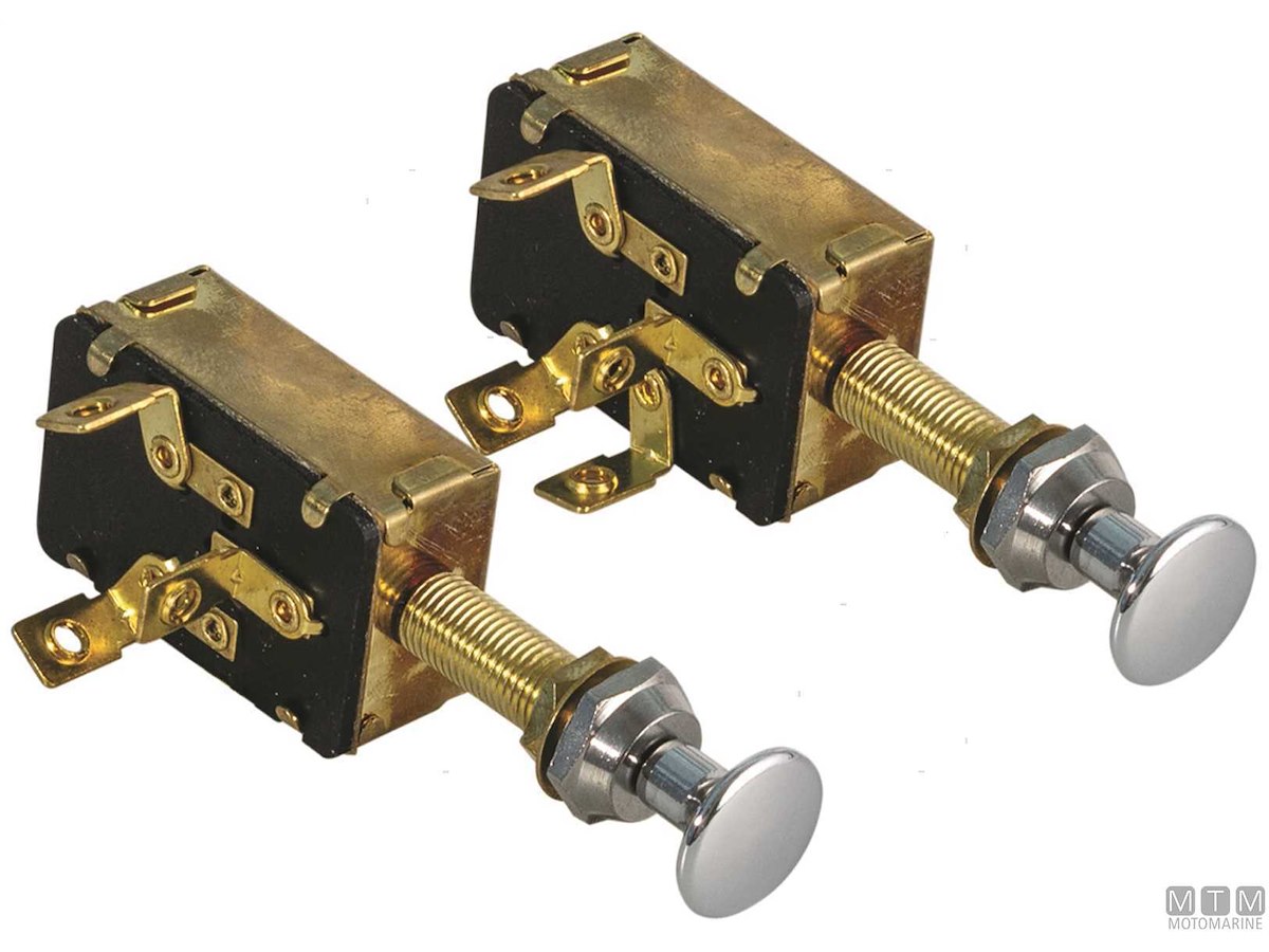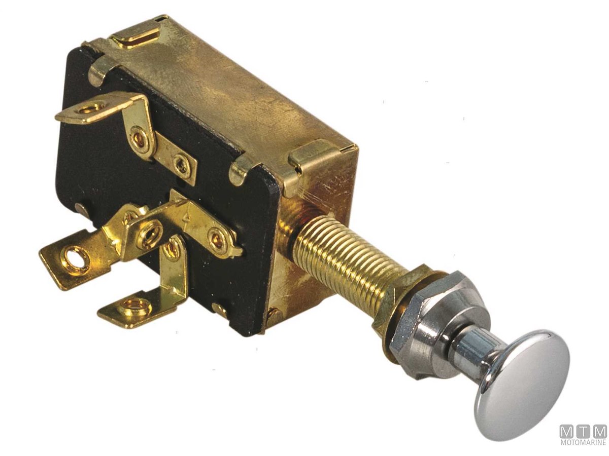 Interruttore con corpo in Ottone e pulsante a tiretto in Ottone Cromato. Per 2 circuiti. Foro da 9 mm.
