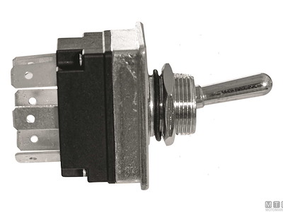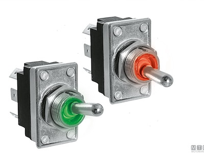 Interruttore a levetta impermeabile IP68 con guarnizione in Nitrile e luce di funzione LED rosso/verde. Corpo inossidabile amagnetico con filetto collo M16 e circuito bipolare 12/24V-20A.