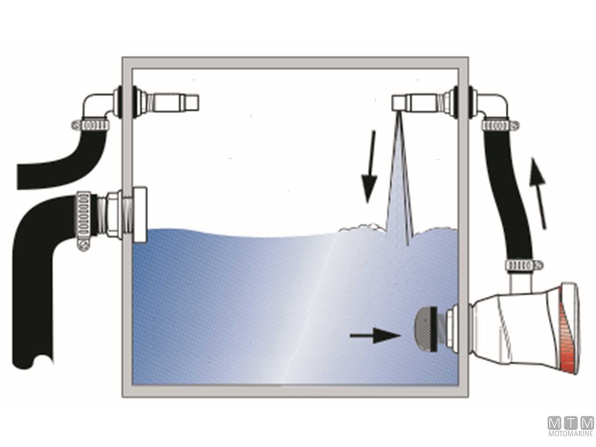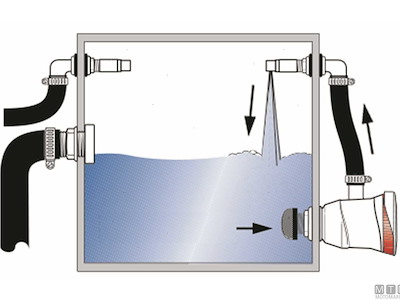 Kit di ossigenazione Attwood Tsunami Recirq che consente la circolazione forzata e l'ossigenazione autonoma dell'acqua nella vasca del pescato senza passascafo esterno. Comprende: