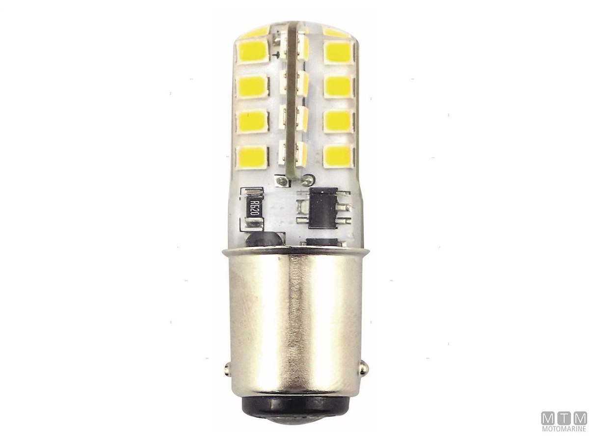 Lampadina BA15D LED bipolare con perni paralleli.Immersa in composto di gomma siliconica trasparente impermeabile.Consumi minimi (2.5W) per una resa luce di 20W.Luce bianca calda 3000 K°.