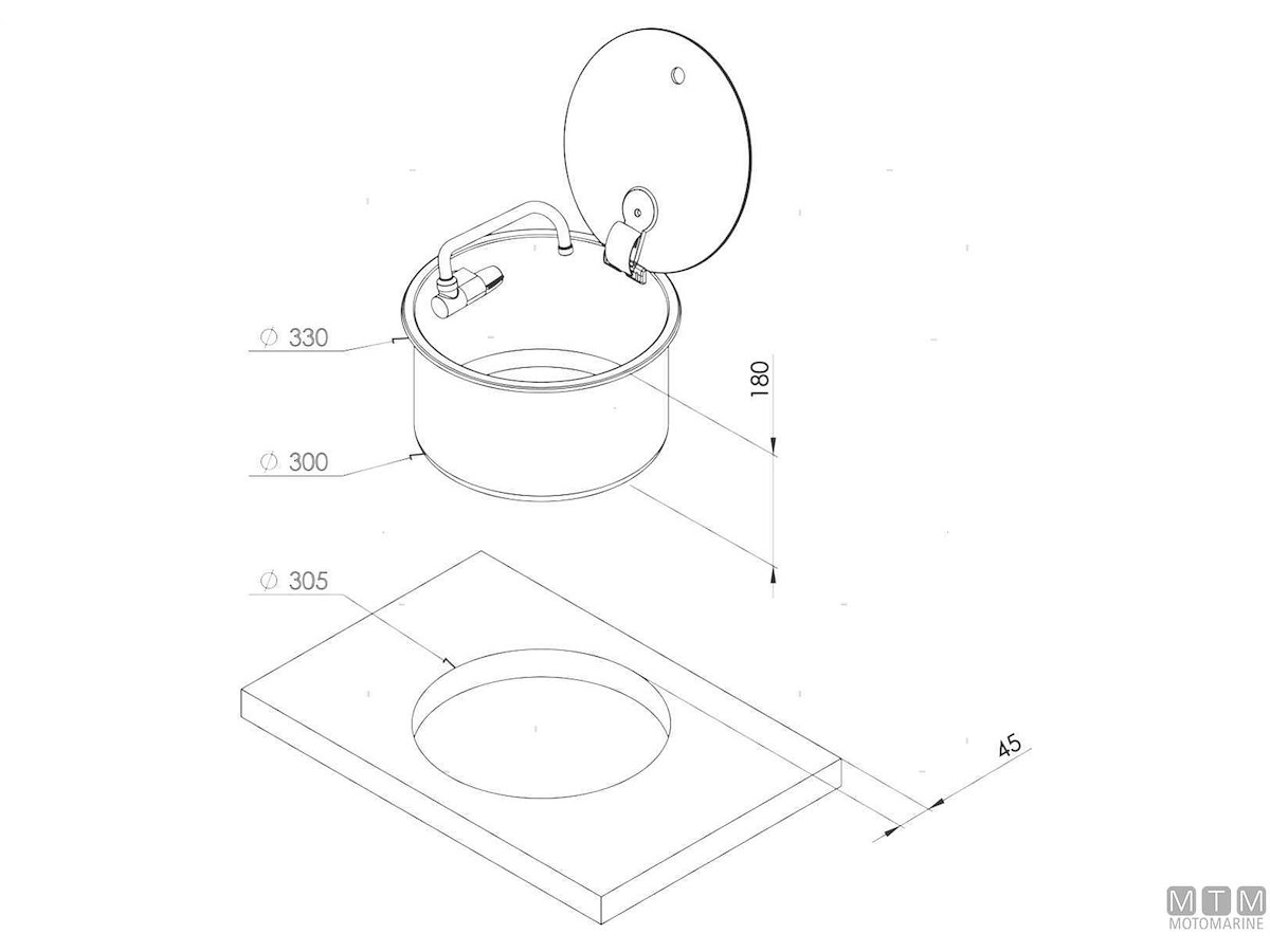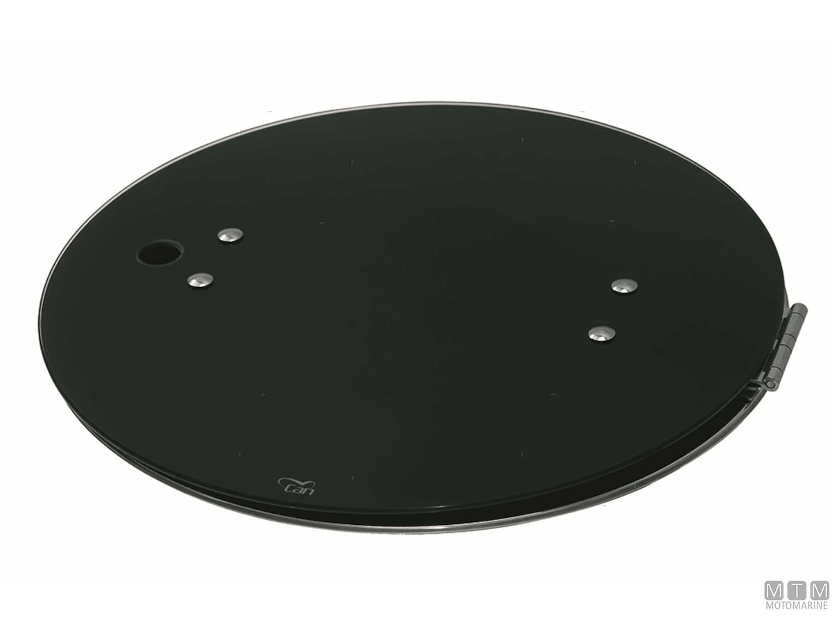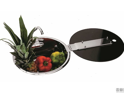 Lavello tondo con coperchio in Vetro temperato e vasca in Acciaio Inox 18/8. Completo di rubinetto pieghevole, da completare con piletta ø 50 mm.