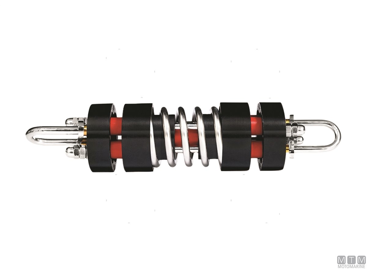 Molla da ormeggio MK40 Ibrido, per imbarcazioni da 1 a 4 tonnellate. La molla viene coadiuvata dagli elastomeri che ne aumentano il carico inerziale.- Forza ammortizzante progressiva
