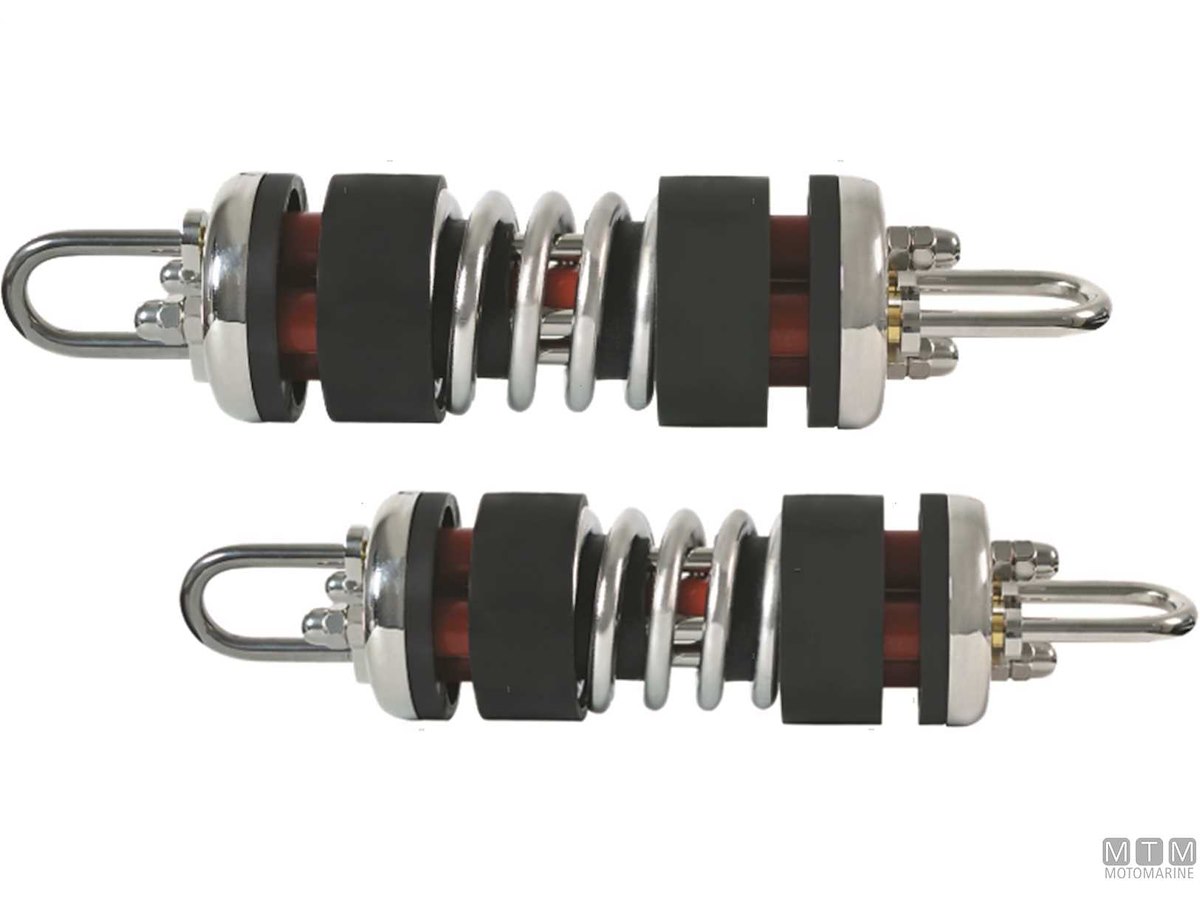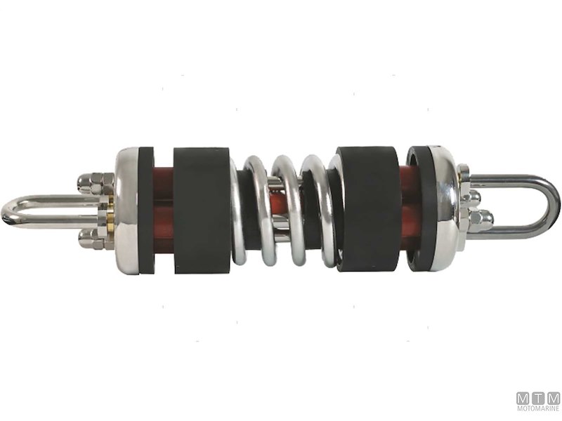 Ammortizzatori da ormeggio ibridi ad alte prestazioni ed elevata capacità ammortizzante. Sviluppano una forza ammortizzante modulare in tre stadi: 1- La molla centrale assorbe le piccole sollecitazioni 2- L'elastomero centrale interviene e incrementa la forza ammortizzante 3- Gli elastomeri laterali intervengono in caso di sollecitazione forte La molla centrale, in Acciaio Inox ad altissime prestazioni, ha la funzione di assorbire la piccola e media risacca nei porti per un maggiore comfort e silenziosità. L'elastomero centrale incrementa la capacità ammortizzante intervenendo in condizioni avverse e viene coadiuvato, in caso di forti sollecitazioni, dagli elastomeri laterali che ne potenziano la capacità di assorbimento.