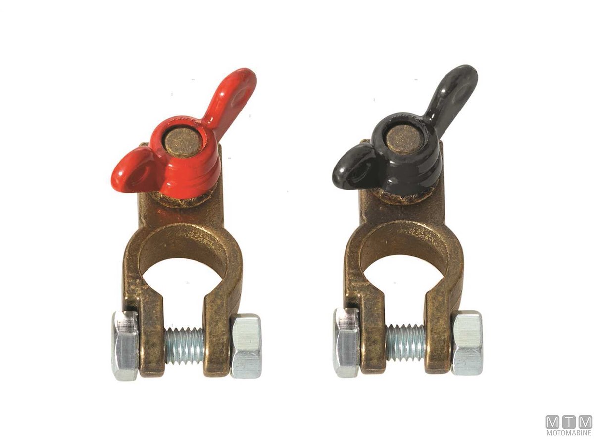 Morsetti batteria venduti in coppia con corpo e attacco ø 16(-)/18(+) mm in lega di Ottone, vite M8 in Acciaio Inox 316 e farfalla M8 isolata con vernice rossa e nera.