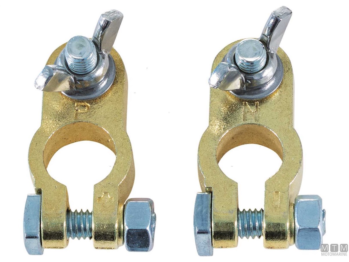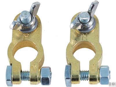 Morsetti batteria standard venduti in coppia in pratici blister da esposizione. Morsetti ø 16(-)/18(+) mm in lega di Ottone, vite e farfalla M8 in Acciaio.