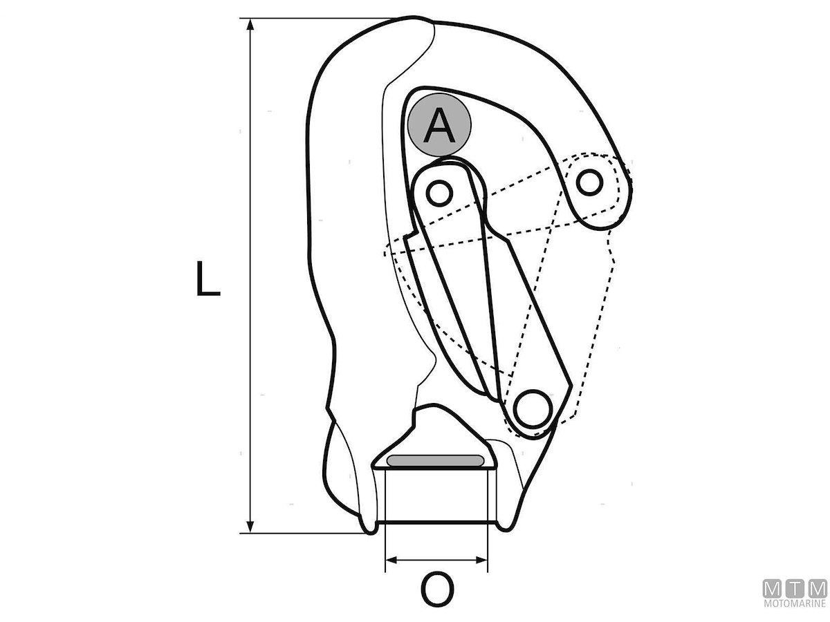 Moschettone di sicurezza con passa-cinghia per cinture di sicurezza e imbracature su barche a vela. Completo di sicura di blocco e difese in composito. Costruzione robustissima in Acciaio Inox AISI 316.