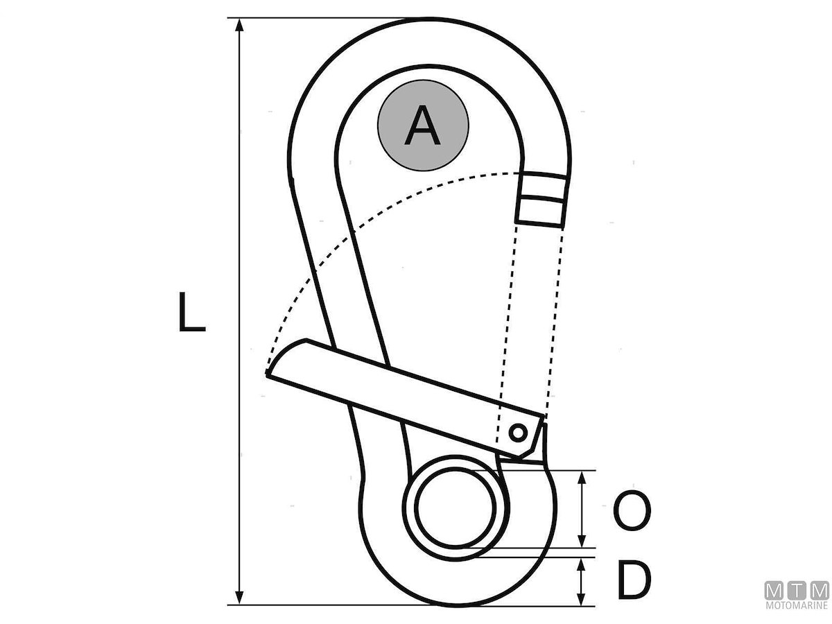 Moschettone in Acciaio Inox AISI 316 con grande apertura laterale e occhio. Sistema di aggancio antigrip. Non impiglia le cime.