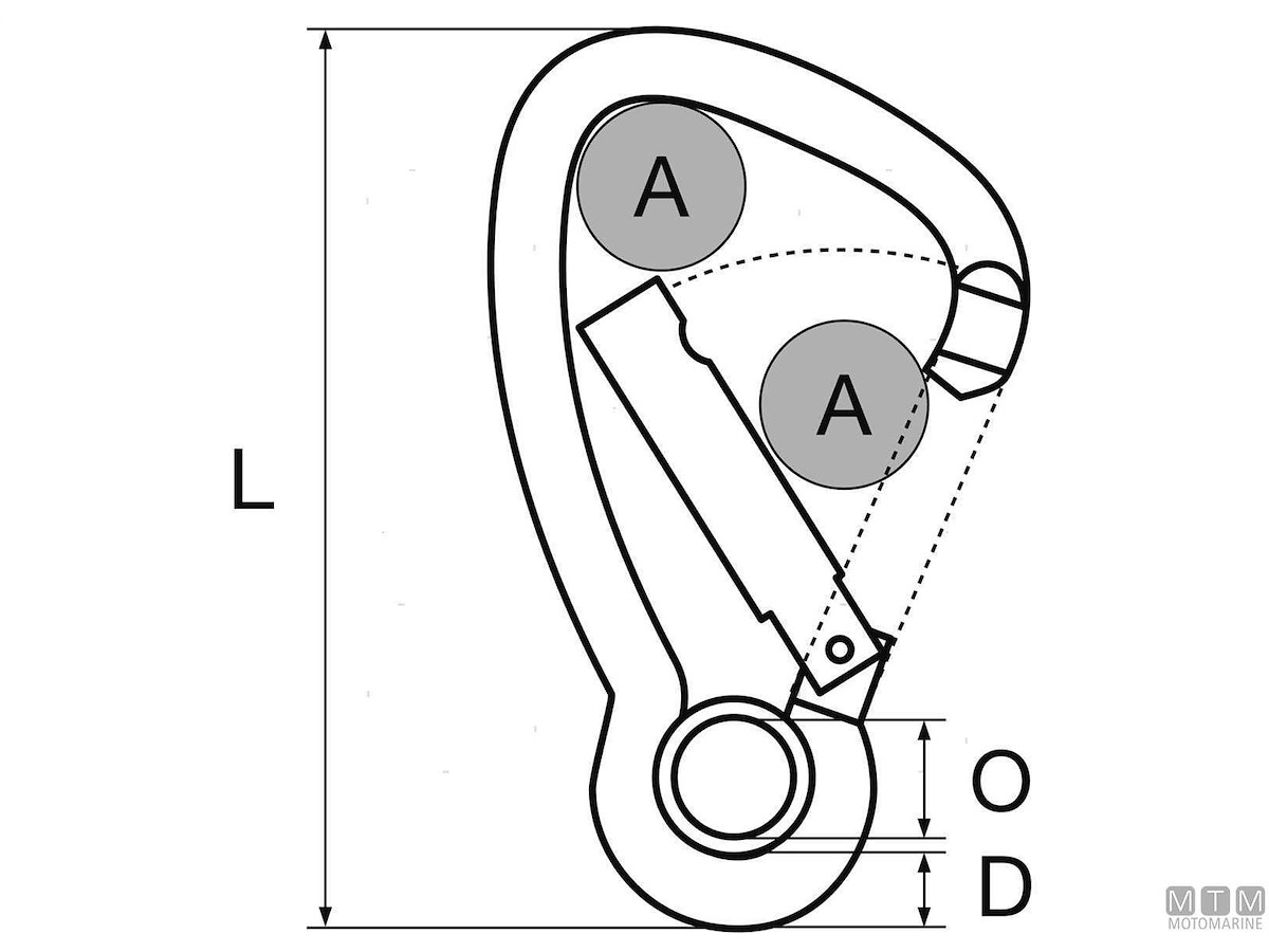 Moschettone in Acciaio Inox AISI 316 con grande apertura e occhio. Sistema di aggancio antigrip. Non impiglia le cime.