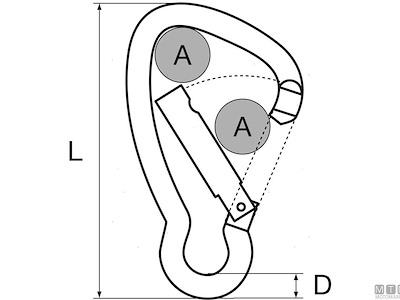 Moschettone in Acciaio Inox AISI 316 con grande apertura. Sistema di aggancio antigrip. Non impiglia le cime.
