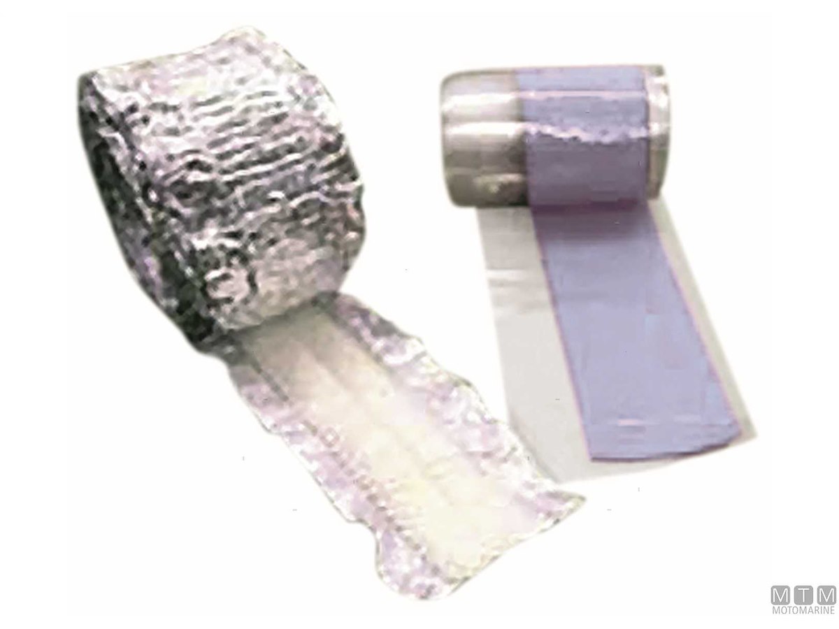 Nastro Termo isolante elastico Fiberglass-Metal resistente ad altissime temperature. Si compone di tessuto in fibra di Vetro accoppiato a una lamina di Alluminio che lo rende più flessibile. Dotato di proprietà elastiche può essere facilmente applicato anche alle curve degli scarichi. Normalmente 2/3 strati sono sufficienti per la maggior parte delle applicazioni di scarico Diesel. Temperatura massima di esercizio: 600 C°. A scelta si può aggiungere uno strato protettivo esterno di Nastro Elastomero Autoamalgamante resistente ad alte temperature per creare una superficie omogenea.